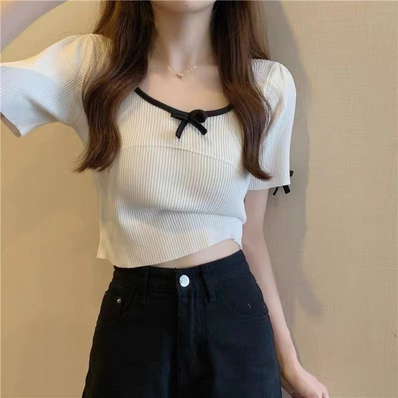 Giới thiệu Áo Thun Dệt Kim Tay Ngắn Đính Nơ Xinh Xắn Cho Nữ 164541 Áo Croptop Dáng Ôm Thiết Kế Đơn Giản Hợp Thời Trang