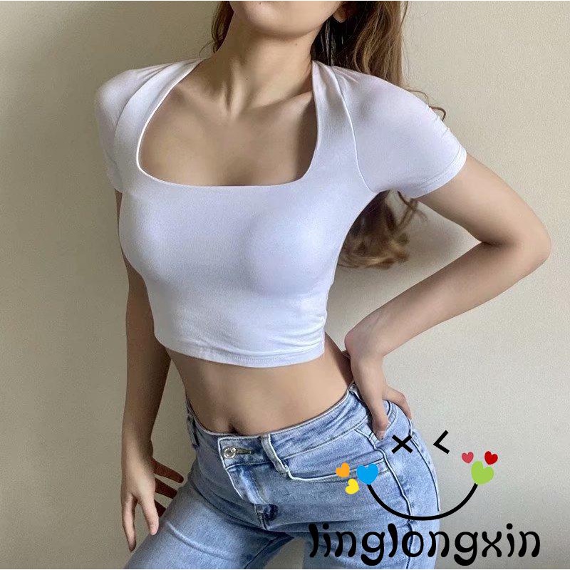 Giới thiệu Áo Thun Mùa Hè Tay Cộc Khoét Sâu Màu Trơn Ôm Dáng Cho Nữ Linglongxi2