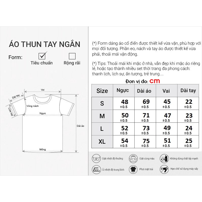 BẢO QUẢN ÁO THUN ĐÚNG CÁCH - Nên giặt chung với sản phẩm cùng màu - Không dùng thuốc tẩy hoặc xà phòng có tính tẩy mạnh - Nên phơi trong bóng râm để giữ sp bền màu - Giặt tay để sản phẩm giữ được độ bền cao - Ủi sản phẩm bằng bàn ủi hơi nước hoặc ủi khi sản phẩm còn ẩm để dễ dàng làm phẳng