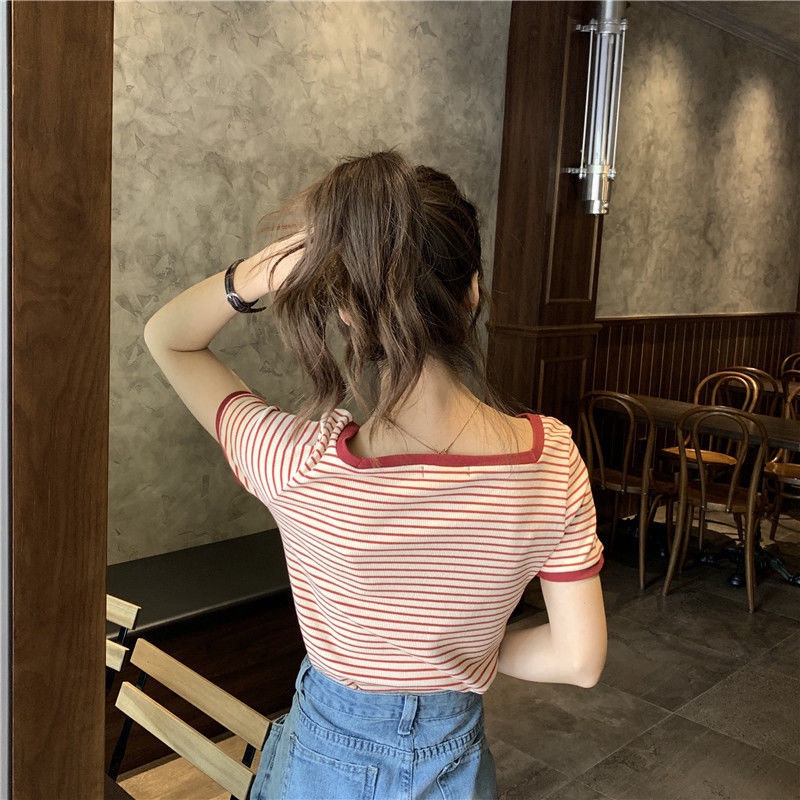 Giới thiệu Áo Thun Nữ Ngắn Tay Cổ Vuông Họa Tiết Sọc Ngang Thời Trang