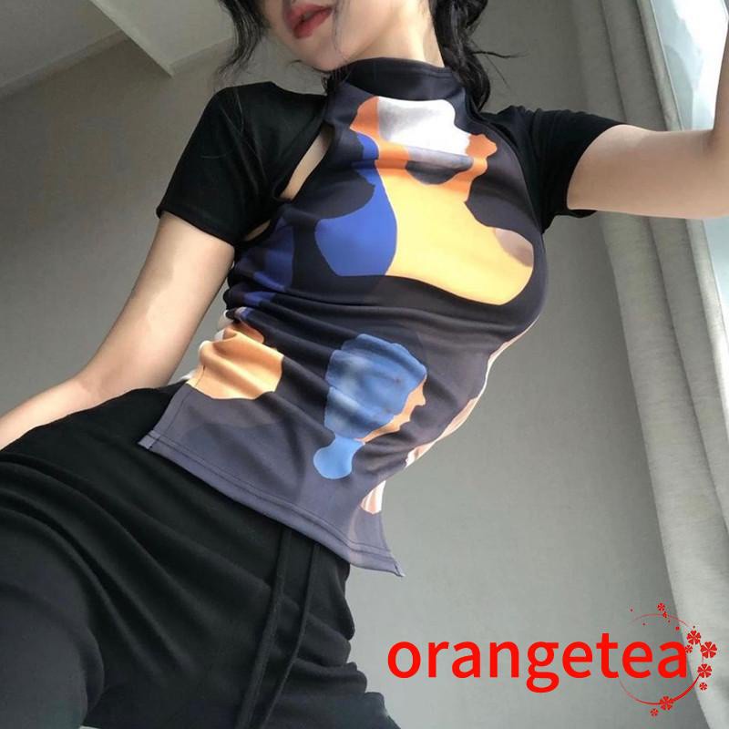 Áo nữ cổ lọ, áo thun ôm cắt khoét in đồ hoạ chân dung tay ngắn thời trang