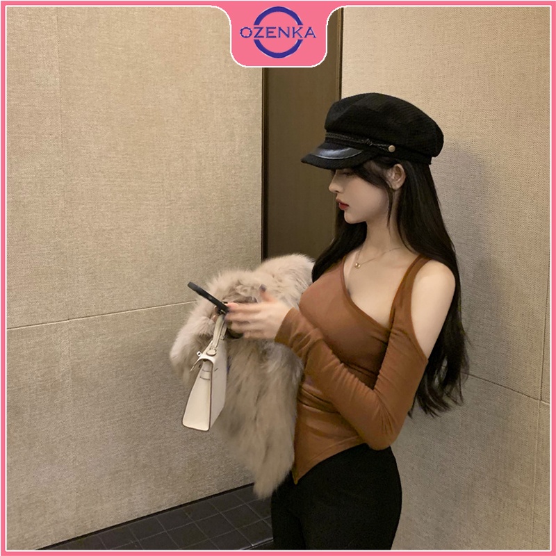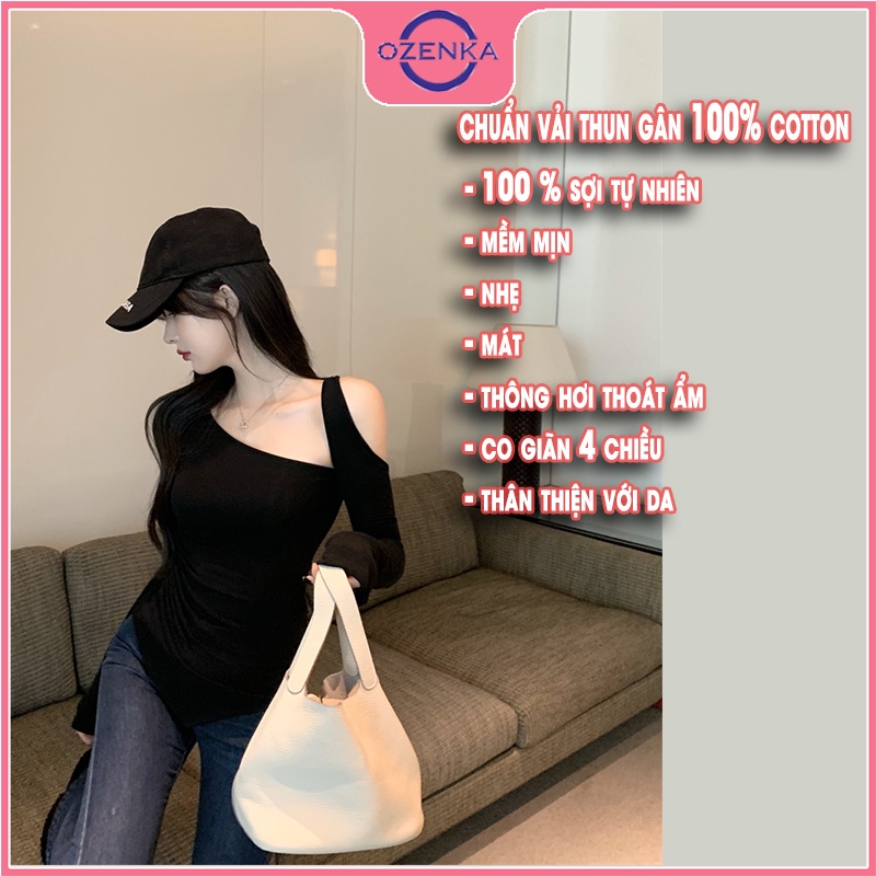 Giới thiệu Áo thun nữ vạt nhọn ôm trễ vai tay dài nữ OZENKA , áo phông body sang chảnh 2022 màu đen trắng be một size dưới 50 kg