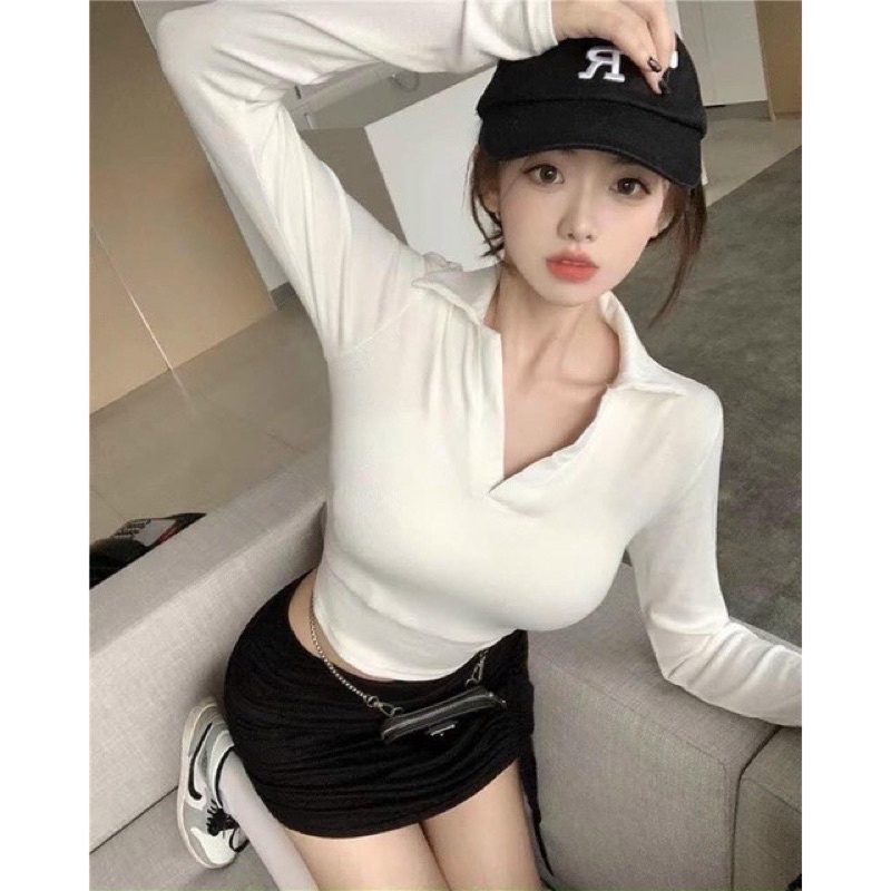 Giới thiệu Áo thun ôm Body nữ Croptop Tay Dài Cổ Bẻ Trơn ( Vạt Ngang )