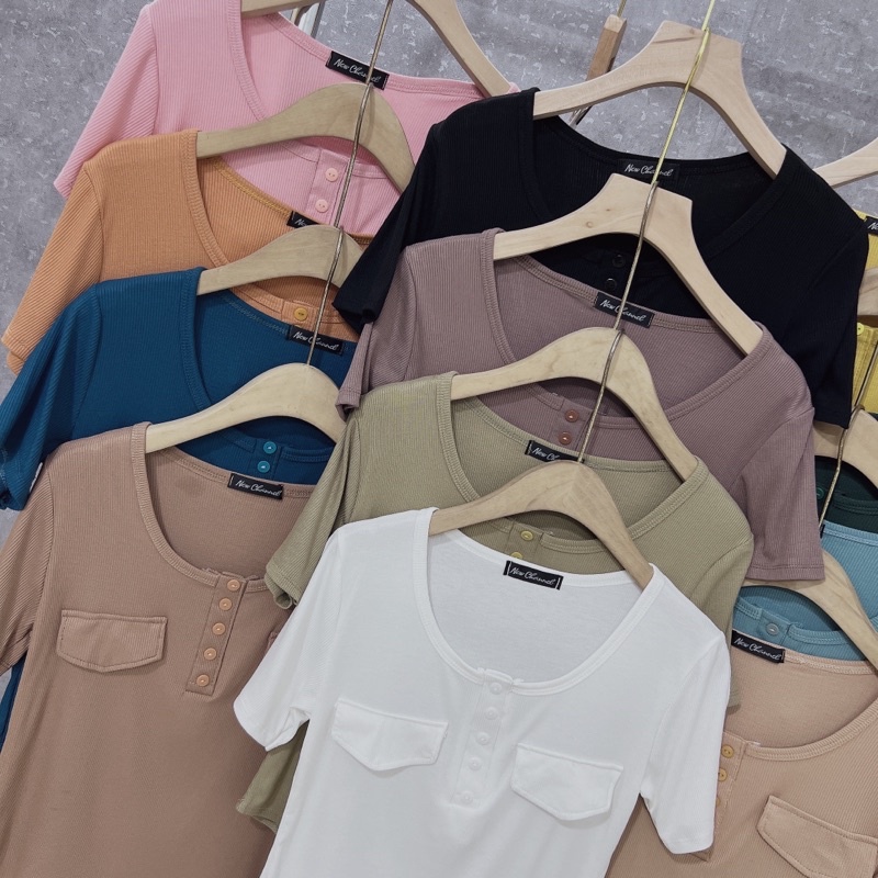 Giới thiệu Áo thun tăm cài cúc hai túi, Áo kiểu dáng ôm cúc ngực co giãn AS6529 - NhiNhi Shop