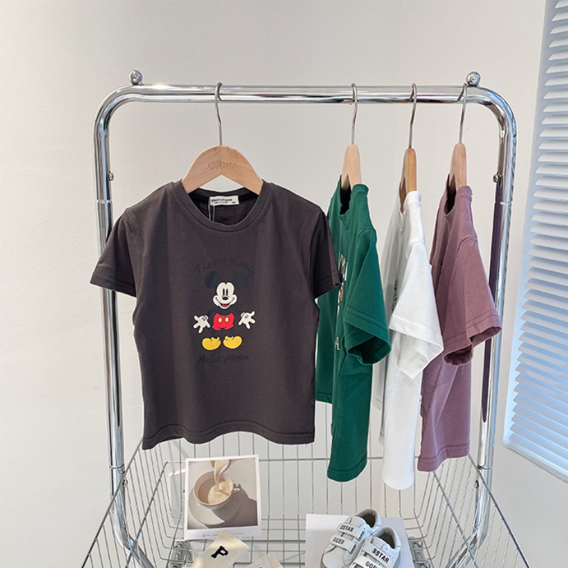2. Phong cách phương Tây in hình hoạt hình tất cả các kết hợp thiết kế ngắn tay cổ tròn, làm nổi bật sự ngọt ngào và dễ thương của bé;