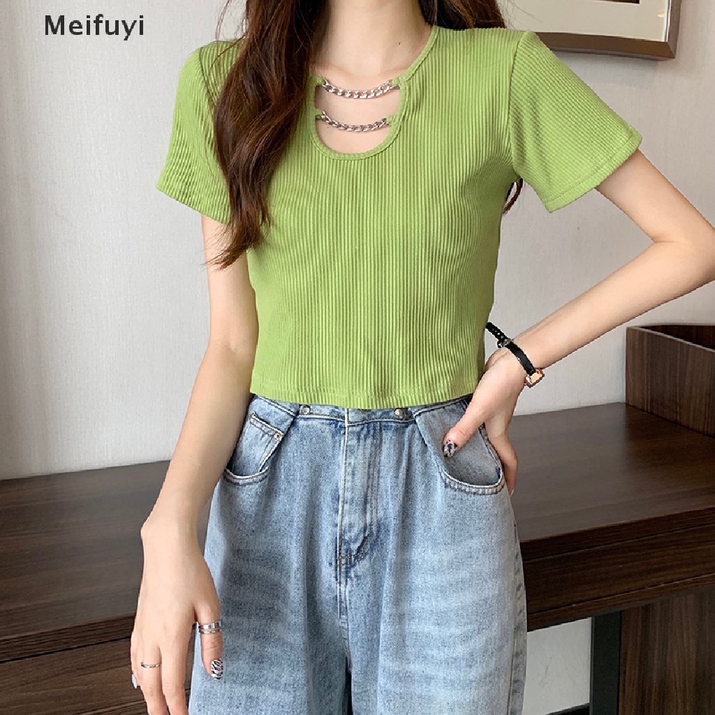 Áo Thun Tay Ngắn Màu Trơn Phối Dây Xích Thời Trang Mùa Hè Cho Nữ