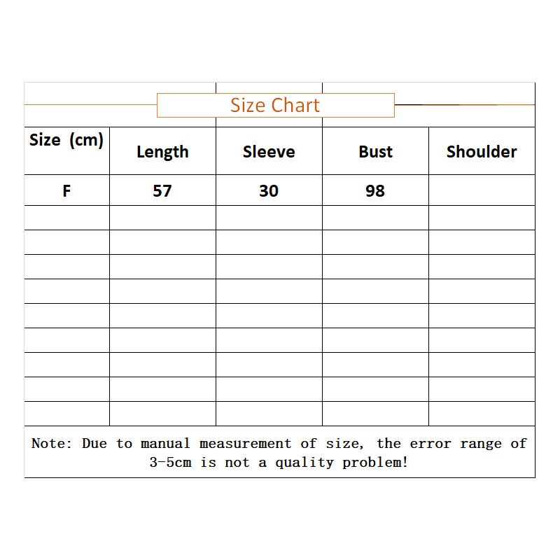 Một kích thước phù hợp với tất cả: Chiều dài: 57 Chiều dài tay áo: 30 Lật tẩy: 98