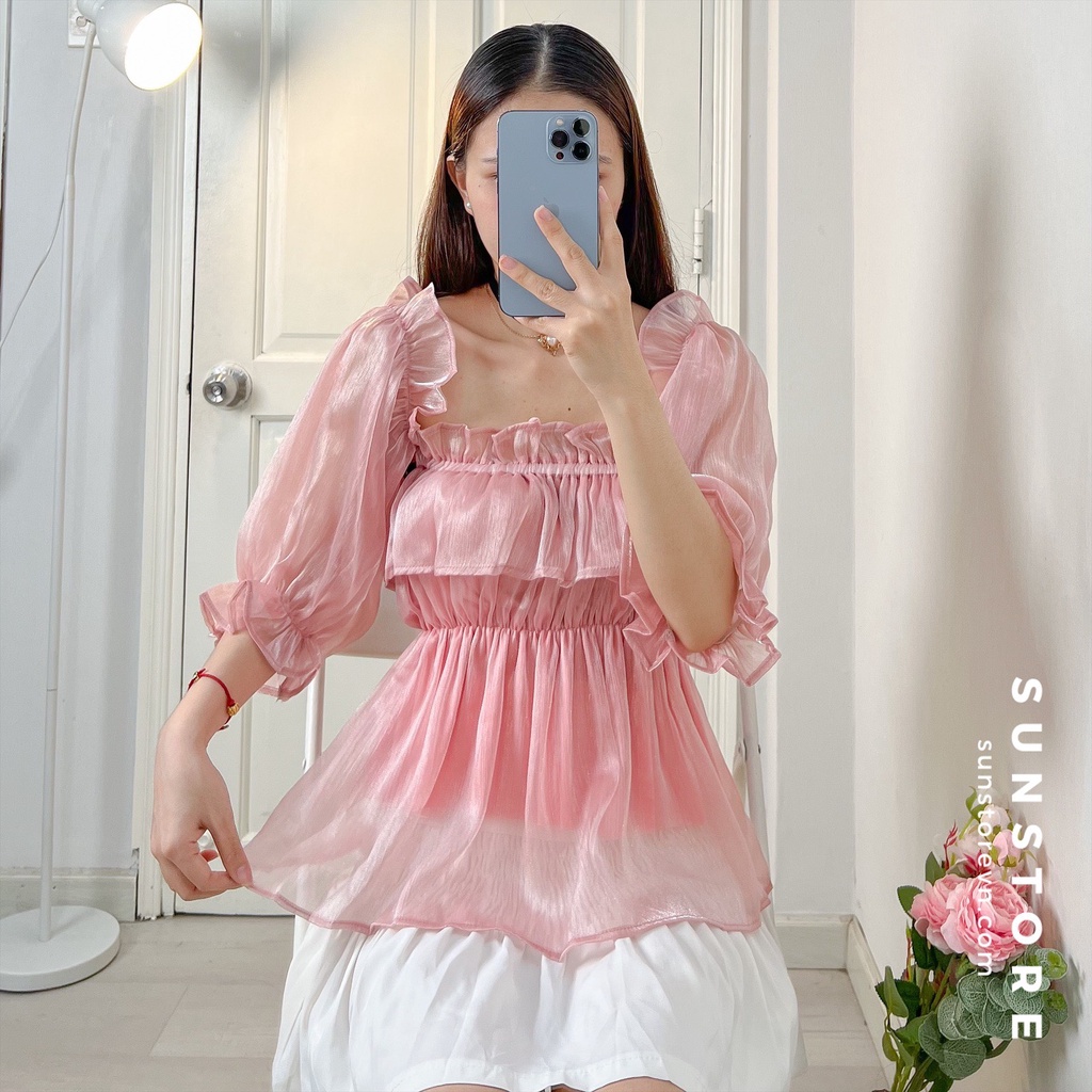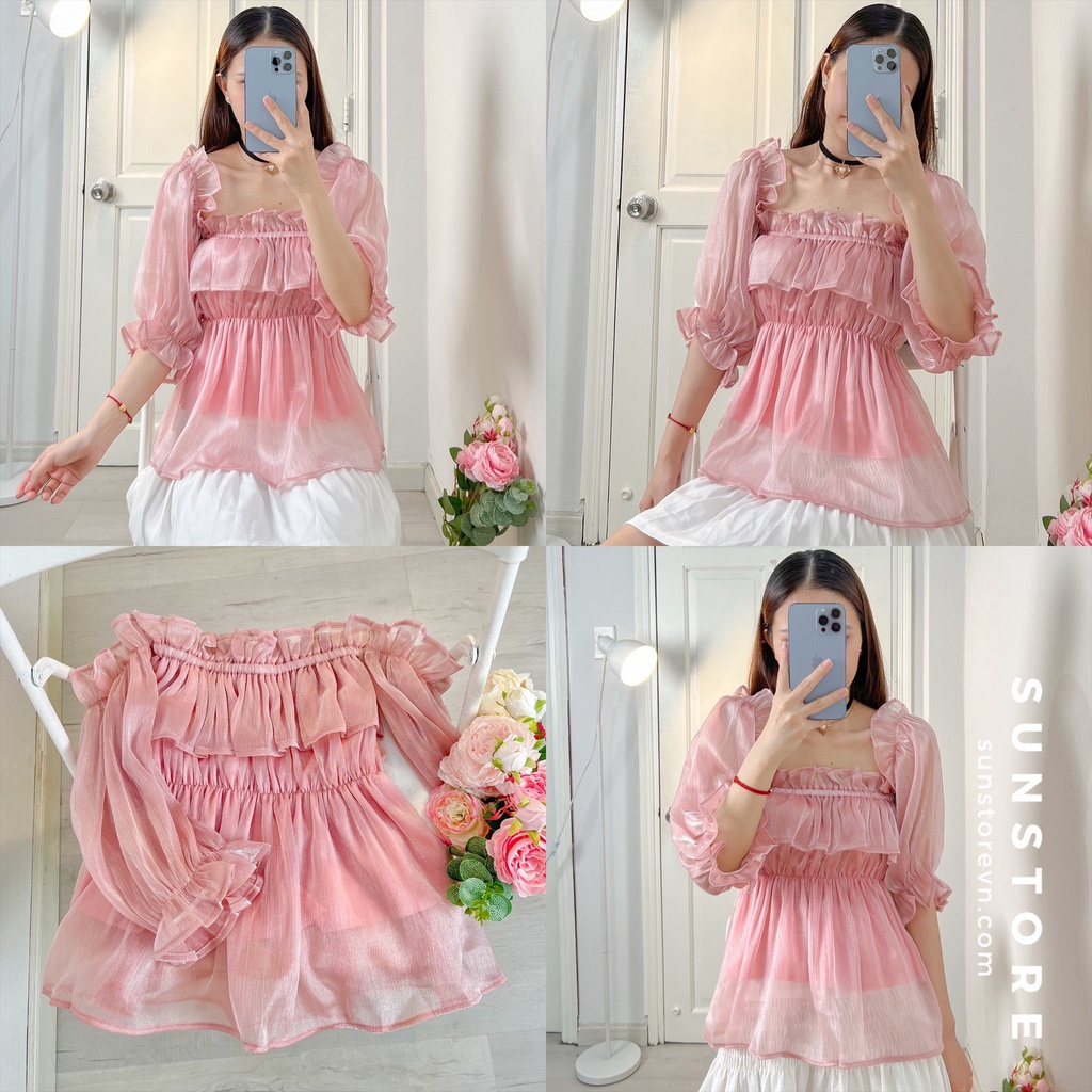 Áo trễ vai kiểu nữ tay phồng xinh xắn chất liệu vải organza freesize màu hồng