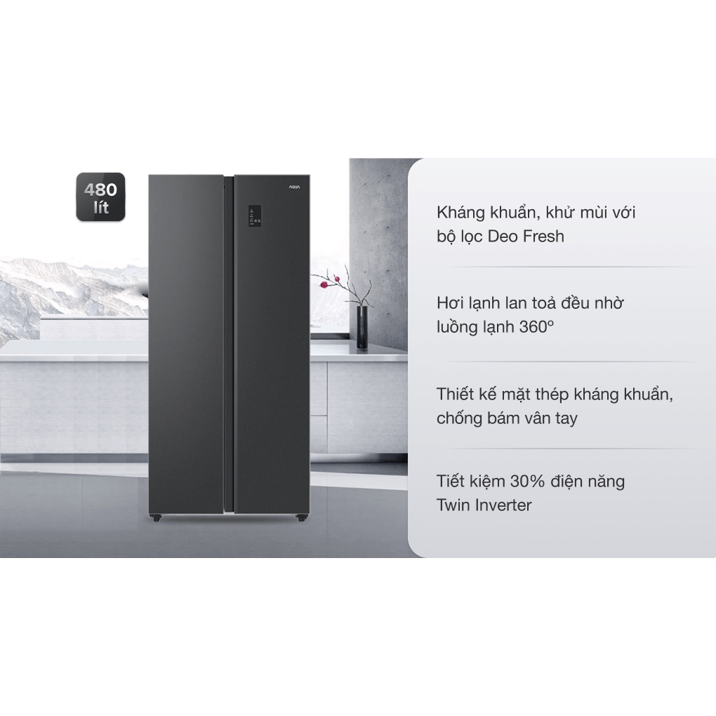 Thông số kỹ thuật Tủ lạnh Aqua Inverter 480 lít AQR-S480XA(BL) Kiểu tủ: Tủ lớn - Side by side - 2 cánh Dung tích sử dụng: 480 lít - 4 - 5 người Dung tích ngăn đá: 197 lít Dung tích ngăn lạnh: 283 lít Công suất tiêu thụ công bố theo TCVN: ~1.52 kW/ngày Công nghệ tiết kiệm điện: Chế độ Holiday Twin Inverter Công nghệ làm lạnh: Gián tiếp Công nghệ kháng khuẩn, khử mùi: Kháng khuẩn khử mùi DEO Fresh Công nghệ bảo quản thực phẩm: Làm lạnh đa chiều giúp thực phẩm tươi ngon Chất liệu cửa tủ lạnh: Mặt thép kháng khuẩn Chất liệu khay ngăn lạnh: Kính chịu lực Kích thước tủ lạnh: Cao 177.5 cm - Rộng 83.6 cm - Sâu 64.7 cm - Nặng 85 kg Năm ra mắt: 2021 Sản xuất tại: Trung Quốc Hãng: Aqua.