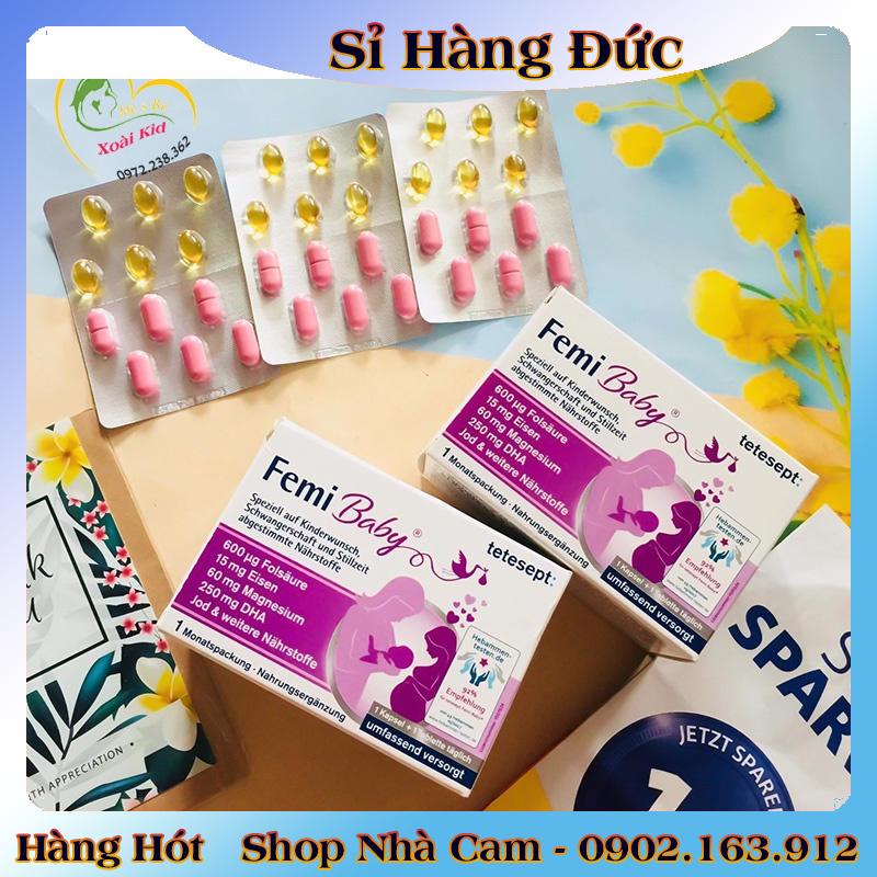 Vitamin tổng hợp cho mẹ bầu và sau sinh Femibaby của Đức Xuất xứ: Đức Quy cách: Hộp gồm 5 vỉ, mỗi vỉ 6 viên nang (mầu vàng) và 6 viên nén (mầu hổng) như ảnh chụp.