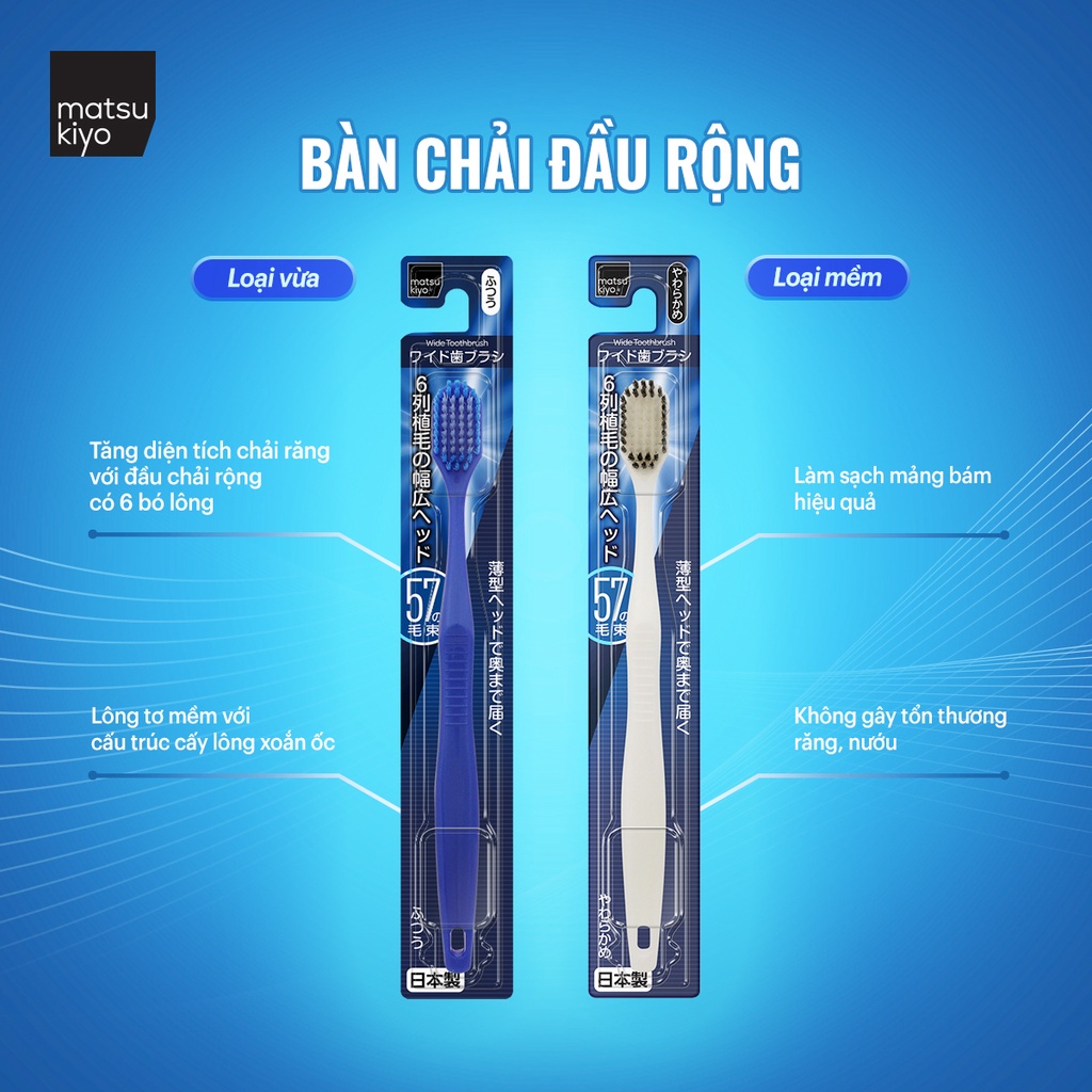[HSD: 01/12/2022] - Thông tin sản phẩm: Đầu bàn chải rộng với 6 bó lông làm tăng diện tích chải răng, lông tơ mềm mại với cấu trúc cấy lông xoắn ốc giúp dễ dàng làm sạch mảng bám hiệu quả mà không gây tổn thương răng nướu. - Thành phần: ○ Phần thân: Polypropylene ○ Phần lông bàn chải: Saturated polyester resin - Hạn sử dụng: 3 năm kể từ ngày sản xuất - Hướng dẫn sử dụng: Đánh răng với lực nhẹ nhàng để tránh tổn thương nướu. Sợi lông mềm và mảnh nên trong quá trình sử dụng có thể bị rơi ra hoặc mắc kẹt vào kẽ răng, trong trường hợp đó hãy thay bàn chải mới. Không ngâm bàn chải trong hóa chất tẩy rửa hoặc nước sôi. Sau khi sử dụng rửa sạch với nước và để khô. Nên khám nha khoa định kỳ. - Thông tin thương hiệu: Matsumoto Kiyoshi là chuỗi bán lẻ dược, mỹ phẩm hàng đầu tại Nhật Bản, được thành lập từ năm 1932 tại Chiba với tên gọi Matsumoto Yakuho. Matsukiyo cung cấp đa dạng các sản phẩm chính hãng chăm sóc sức khỏe và sắc đẹp bao gồm sản phẩm chăm sóc da, trang điểm, dụng cụ làm đẹp, thực phẩm chức năng, hóa mỹ phẩm chăm sóc gia đình, nhà cửa,... - Xuất xứ: Nhật Bản