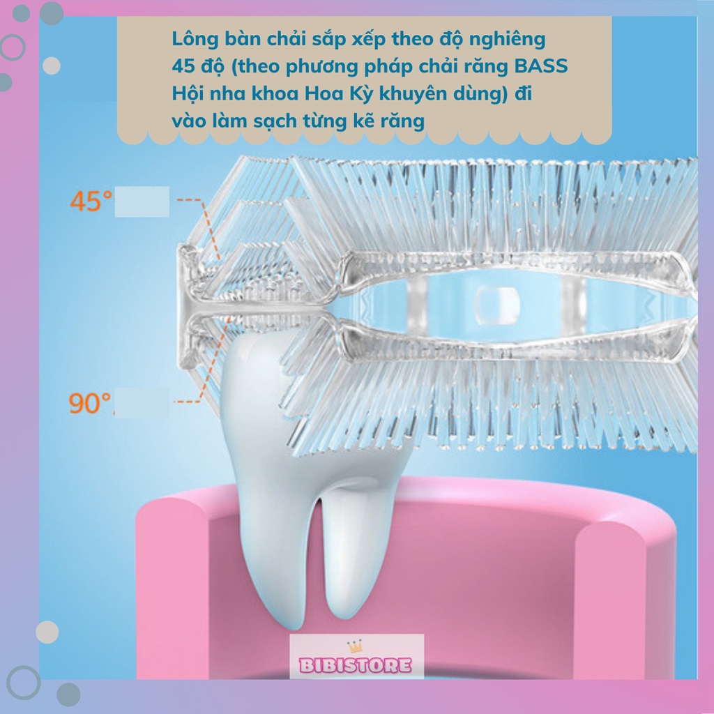 ✅ Thông tin sản phẩm: - Thiết kế chữ U ôm trọn hàm răng bé, làm sạch các mảng bám một cách thông minh, nhẹ nhàng bảo vệ răng lợi cho bé. - Bàn chải thiết kế sinh học 360 độ bọc toàn bộ hàm răng nên bé không cần đổi bên đánh răng. - Lông bàn chải sắp xếp theo độ nghiêng 45 độ (theo phương pháp chải răng BASS Hội nha khoa Hoa Kỳ khuyên dùng) đi vào từng kẽ răng ôm trọn hàm răng bé, làm sạch toàn bộ mảng bám, ngừa sâu răng tối đa. - Đầu bàn chải chất liệu silicon cấp thực phẩm, nguyên liệu chuyên dùng cho sản xuất núm ti giả cho bé, cực an toàn. - Tránh mòn men răng do bé đánh răng sai cách. Bảo vệ nướu và lợi tốt hơn, hỗ trợ ngừa sâu răng. - Kích thước nhỏ gọn vừa vặn với tay cầm của bé. - Bàn chải có hình dáng xinh xắn làm bé thích thú và hào hứng hơn khi đánh răng. Từ đó tạo thành thói quen đánh răng mỗi ngày cho bé sau này. - Sử dụng 1 pin AAA, dùng được lên tới 60 ngày (Máy kèm sẵn 1 Pin) - Tặng kèm Kem đánh răng taọ bọt có thể nuốt được.