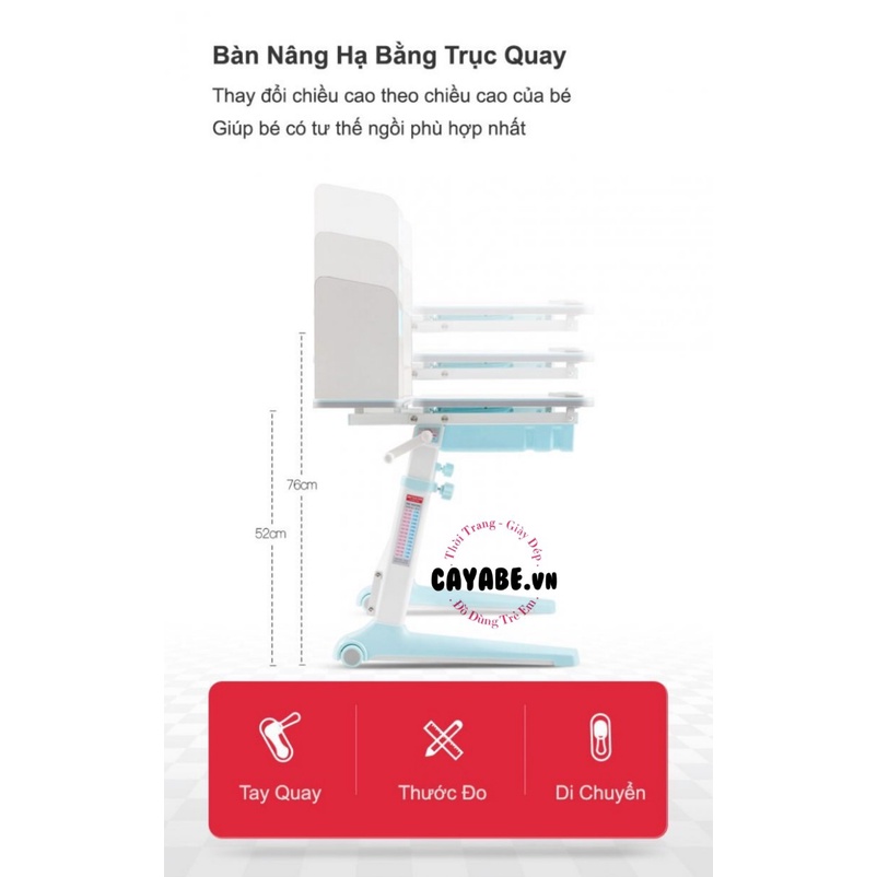 2. Đặc điểm của bộ bàn học sinh thông minh mã CB-002: - Chất liệu: Khung thép không gỉ cao cấp sơn tĩnh điện 2 lớp. - Mặt bàn: Được thiết kế chia thành 2 phần, một phần để bé viết bài và làm bài tập, phần còn lại để đựng sách vở và các dụng cụ học tập. Mặt bàn sơn phủ formica giúp chống loá, chống nước, chống lửa và chống xước, bo viền giảm tối đa va đập. - Giá để sách: Bàn học thông minh được thiết kế thêm giá sách nhằm tạo nên góc học tập tiện lợi, bé có thể sắp xếp và trang trí theo sở thích của mình. - Cạnh bàn: Được bao bọc một đường viền màu xanh hoặc hồng và tất cả đều được bo tròn không góc cạnh để đảm bảo an toàn cho bé. - 02 Ngăn bàn/ hộc tủ rộng rãi: Ngăn bàn được thiết kế rộng rãi bé có thể để sách vở và đồ dùng học tập trong ngăn bàn. - BÀN HỌC THÔNG MINH CHỐNG GÙ, CHỐNG CẬN CAYABE CB-002 còn được thiết kế chỗ để chân thông minh để bé có thể cảm thấy thoải mái khi ngồi học.