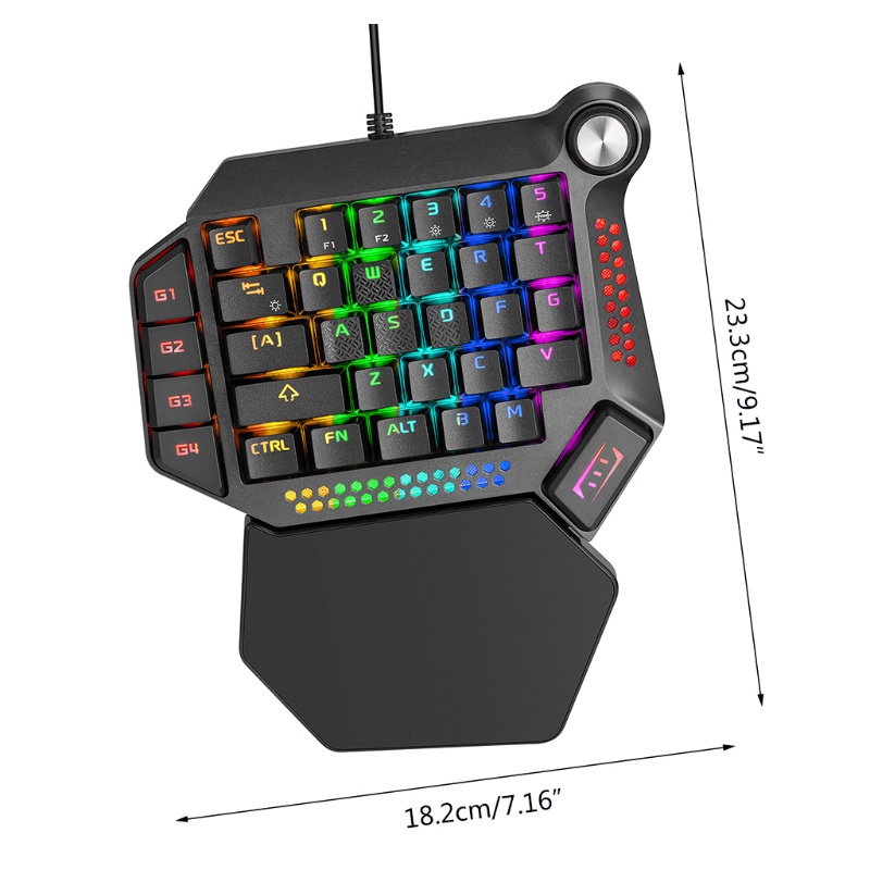 Đặc điểm kỹ thuật: Tên sản phẩm: bàn phím một tay cơ Kích thước sản phẩm: xấp xỉ. 233x182x38mm / 9,17x7,17x1,50in Chất liệu: ABS Số lượng phím: 35 phím Phương thức truyền: USB có dây Tuổi thọ phím: 5000W lần Nhiệt độ hoạt động: 0℃~ 40℃ Độ ẩm hoạt động: ≤85% Điện áp làm việc: 5V ± 0.5 Làm việc hiện tại: ≤350mA (MAX) Màu sắc: Cầu vồng, xanh lá cây (tùy chọn) Hệ thống áp dụng: Win2000, Win XP, Win ME, Vista, Win7, Win8, WIN10.