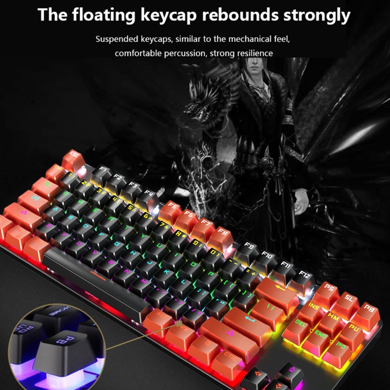 Thông số kỹ thuật: Tên sản phẩm: Bàn phím cơ trò chơi Vật liệu bàn phím: ABS Số bàn phím: 87 phím Phương thức kết nối: có dây Phương thức kết nối: USB2.0 Tuổi thọ bàn phím (lần): 50 triệu Tốc độ phản hồi: 0,1ms Chiều dài cáp bàn phím: xấp xỉ. 150cm Kích thước sản phẩm: Xấp xỉ. 35,3x12,6 x3,5 cho cm / 13,90x4,96x1,38in Màu sắc: đen / trắng / đen cam / đen cam