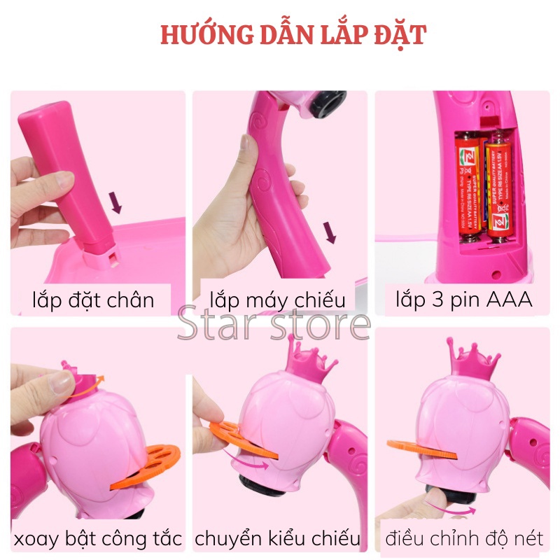 Thông tin sản phẩm: Chất liệu: Nhựa Gói hàng bao gồm: + 1 Máy chiếu tranh + 3 Trang trình bày + 12 bút nước + 1 cây xóa Xuất Xứ : Trung Quốc Hướng dẫn sử dụng: - Sản phẩm sử dụng pin AA, sản phẩm bán không kèm pin. shop sẽ lắp pin và test trước khi gửi cho quý khách. - Cho pin vào khay pin đằng sau - Cho lăng kính vào miệng máy nghe thấy tạch 1 cái là đã đúng vị trí - Bật công tắc trên đầu máy ( Núm xoay và mào) - Nếu ảnh bị mở hay xoay thấu kính phía dưới đèn chiếu ( Giống như mình xem kính hiển vi vậy).