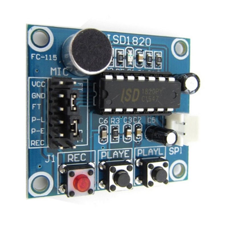 Bảng mô-đun giọng nói ISD1820 với Micrô và Loa Tương thích với Các tính năng: Ghi và phát giọng nói 10 giây tiện lợi. Chất lượng cao, phục hồi giọng nói một cách tự nhiên. Có thể được sử dụng như mô-đun megaphone. Với các chức năng phát vòng lặp, inching-play và phát một lần. Có thể được điều khiển bằng máy vi tính chip đơn. Mô-đun này có thể điều khiển trực tiếp loa nhỏ 8 Ω 0,5W.