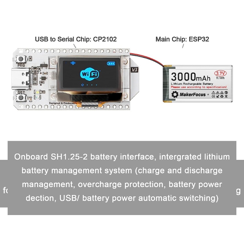 Bảng phát triển ESP32 OLED được nâng cấp 8MB Flash 0.96 Inch Màn hình OLED WiFi BT Các tính năng: thương hiệu mới và chất lượng cao Môi trường phát triển hỗ trợ: Bộ WiFi 32 là một bảng phát triển IoT Dev cổ điển, nó là một bảng phát triển tích hợp cao dựa trên ESP32 (bao gồm WiFi và BLE). Dễ sử dụng: Với mạch RF tốt và thiết kế công suất thấp, bo mạch phát triển ESP32 là sự lựa chọn tốt nhất cho các loại sân khấu thông minh, trang trại, nhà ở và các nhà sản xuất IoT. Thiết kế mạch hoàn hảo: WiFi trên bo mạch, ăng-ten PCB 2.4GHz răng xanh. Tích hợp chip cổng USB sang cổng nối tiếp CP2102, thuận tiện cho việc tải xuống chương trình, in thông tin gỡ lỗi. Nguồn cung cấp: Giao diện Onboard SH1.25, hệ thống quản lý lithium tích hợp. Bạn cũng có thể sử dụng giao diện Type-C để cấp nguồn cho bảng phát triển, giao diện có khả năng bảo vệ ESD hoàn chỉnh, bảo vệ ngắn mạch, che chắn RF và các biện pháp bảo vệ khác. Oled Dispaly: Màn hình OLED ma trận chấm 0,96 inch 0,96 inch, có thể được sử dụng để hiển thị thông tin gỡ lỗi, nguồn điện và các thông tin khác.