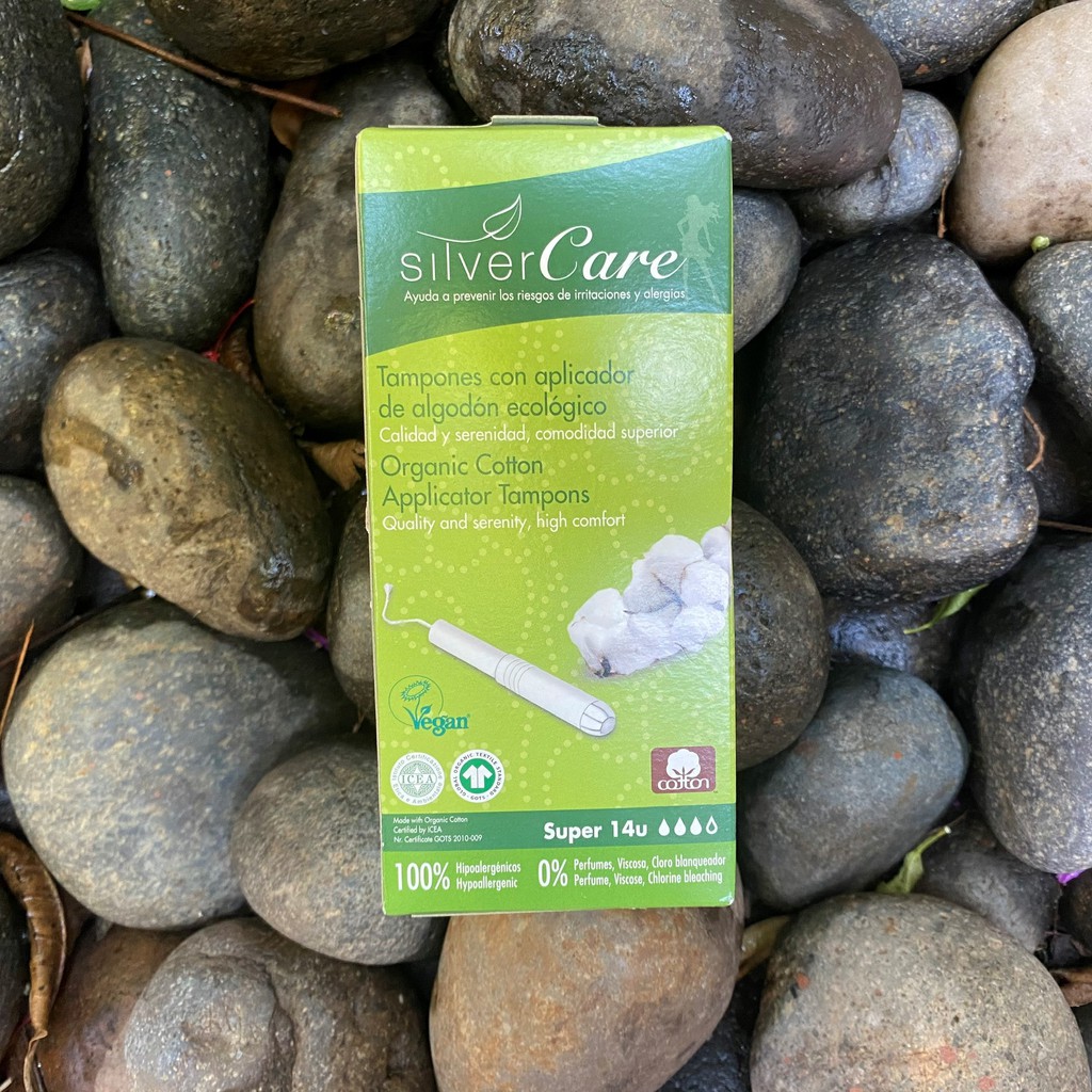 #Tampon #Hữu_Cơ #Có #Cần #Đẩy #Silvercare gồm có 3 loại: + Loại #2_giọt #Regular 16 miếng: Sử dụng cho những ngày đầu và cuối chu kỹ với độ thấm nhẹ. + Loại #3_giọt #Super 14 miếng: Sử dụng cho những ngày tương đối nhiều. + Loại #4_giọt #Super #Plus 14 miếng: Sử dụng cho những ngày chu kỳ ra nhiều đến rất nhiều. Mỗi tampon được đóng gói riêng biệt. Lớp lõi bên trong 100% cotton hữu cơ, không chứa nguyên liệu nhiễm trừ sâu và phân bón hoá học : độ hút ẩm cao và thông thoáng tốt. Màng bảo vệ lớp lõi được thiết kế đặc biệt tránh cho các sợi bông dính vào lớp màng và mô bên trong cơ thể. Đầu dây hỗ trợ kéo tampon được đặt ở trung tâm lõi tampon. Cần đẩy làm từ 100% giấy carton 100% phân hủy sinh học, thiết kế đầu tròn hỗ trợ việc đẩy tampon vào bên trong được thuận tiện dễ chịu. Tampon hữu cơ có cần đẩy bao gồm 3 phần: + Phần cần đẩy (dụng cụ đặt tampon): Có thiết kế tương tự như 1 cái ống tiêm. Phần này thường được làm bằng nhựa hoặc bìa cứng trơn mịn, giúp việc đặt tampon vào âm đạo dễ dàng hơn + Phần lõi thấm hút: Thường được làm bằng sợi tơ nhân tạo kết hợp với sợi bông tổng hợp (riêng tampon hữu cơ thì được làm từ 100% cotton) , được đưa trọn vẹn vào trong âm đạo, có chức năng thấm hút chất dịch. + Phần đuôi: Là 1 đoạn dây dài khoảng 10 cm, nằm ở ngoài âm đạo, dùng để lấy (kéo) tampon ra khỏi âm đạo. HDSD : Để hỗ trợ vệ sinh vùng kín được sạch sẽ, thông thoáng, ngăn ngừa viêm nhiễm và hăm bí, bạn nên thay tampon lâu nhất sau 4-5 tiếng sử dụng. Khi sử dụng tampon, điều quan trọng là để lựa chọn độ thấm hút thấp nhất cần thiết cho lượng kinh của bạn. Và bởi vì lượng thay đổi từ ngày này sang ngày khác, có khả năng bạn sẽ cần phải sử dụng tampon các mức độ thấm hút khác nhau vào những ngày khác nhau trong kỳ kinh. Lựa chọn độ thấm hút phù hợp thì dựa vào kinh nghiệm, nhưng theo sách vở, nếu một tampon hấp thụ càng nhiều càng tốt và phải thay nó trước 4 tiếng, thì bạn nên thử loại có độ thấm hút cao hơn. Trái lại, nếu bạn thay một tampon sau 4-8 tiếng mà sợi trắng vẫn còn, thì bạn nên chọn một loại thấm hút thấp hơn. Khi sử dụng một tampon vào ban đêm tối đa trong 8 tiếng, hãy chọn loại thấm hút thấp nhất, dùng một cái mới trước khi đi ngủ và lấy ra vào sáng hôm sau ngay khi thức dậy. Sản xuất và nhập trực tiếp từ Tây Ban Nha. Nhà phân phối: Công ty Phan Nguyễn - Quận 1, TPHCM Chứng nhận hữu cơ ICEA và GOTS (Global Organic Textiles Standards)