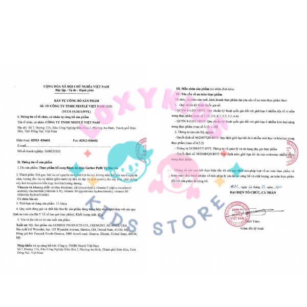 💥 Cam kết : * Chính hãng * Date luôn mới. Khách sỉ liên hệ: 0948692104 để mua sll với giá tốt nhất. Địa chỉ: Shop S-Loxy, 5E3 Thành Thái, Phường Bình Khánh, Tp. Long Xuyên, An Giang. Sữa mẹ là thức ăn tốt nhất cho sức khỏe và sự phát triển toàn diện của trẻ sơ sinh và trẻ nhỏ. Sản phẩm này là thức ăn bổ sung và được ăn thêm cùng với sữa mẹ dùng cho trẻ nhỏ ***Trọng lượng, dung tích, kích thước và mẫu mã bao bì sản phẩm có thể thay đổi tùy từng đợt sản xuất. Quà khuyến mãi đi kèm sản phẩm có thể hết bất cứ lúc nào, hãy liên hệ với shop để biết thông tin chi tiết ***Sản phẩm không phải là thuốc, không có tác dụng thay thế thuốc chữa bệnh. Hiệu quả đạt được sẽ tùy thuộc vào thể trạng và cơ địa của mỗi người. Từ 6 tháng tuổi trở đi, sữa mẹ không còn đủ để thỏa mãn nhu cầu dinh dưỡng cho bé. Chính vì vậy, bé cần bắt đầu tập ăn dặm để hoạt động cơ nhai cũng như bổ sung đầy đủ chất dinh dưỡng cho bé. Bánh ăn dặm Gerber là một trong những thương hiệu nổi tiếng của tập đoàn Nestlé, sản phẩm hiện có mặt trên 80 quốc gia với số lượng chủng loại đa dạng. Gerber đã đạt được những tiêu chuẩn kiểm tra gắt gao về độ an toàn của những tiêu chuẩn về thực phẩm trên thế giới. THÀNH PHẦN: bột gạo, bột lúa mì nguyên hạt, bột yến mạch nguyên hạt, đường, tinh chất táo, hương trái cây tự nhiên, Vtm A, E, B6, B1, B2, B12, các khoáng chất kẽm, sắt, canxi và các phụ gia tự nhiên an toàn cho trẻ. ĐẶC ĐIỂM NỔI BẬT - Sản phẩm (Gerber Puffs) hương vị: chuối, khoai lang, dâu tây - táo, việt quất, đào. - Dành cho trẻ từ 6 tháng tuổi trở lên, có thể ăn kèm bữa chính hoặc sử dụng cho bữa phụ. - Sử dụng ngũ cốc và trái cây tự nhiên để sản xuất, không chứa chất tạo ngọt, chất tạo màu, chất bảo quản hay bất kỳ hoạt chất hóa học nào ảnh hưởng đến cơ thể của trẻ. - Dễ tan ngay trong miệng hoàn toàn tránh được những vấn đề như hóc, nghẹn gây nguy hiểm cho bé. Quy cách chế biến từng hạt nhỏ đủ để đưa vào miệng bé, giúp bé tập với hoạt dộng cầm nắm thức ăn và đưa vào miệng. - Bổ sung những dưỡng chất thiết yếu cần cho sự phát triển toàn vẹn của bé mà cũng sử dụng như một dạng snack với nhiều hình dạng thú vị khiến cho bé tăng khả năng nhận biết và thích thú hơn trong hoạt động ăn dặm đầu đời của mình. HƯỚNG DẪN SỬ DỤNG Cách dùng: Ăn trực tiếp 2 lần/ngày. Bảo quản: - Nơi khô ráo thoáng mát, tránh ánh nắng trực tiếp. - Nên sử dụng sản phẩm trong vòng 14 ngày sau khi mở bao bì. - Không sử dụng nếu bao bì không còn nguyên vẹn. - Sản phẩm sau khi mở cần được đóng chặt và bảo quản kín.