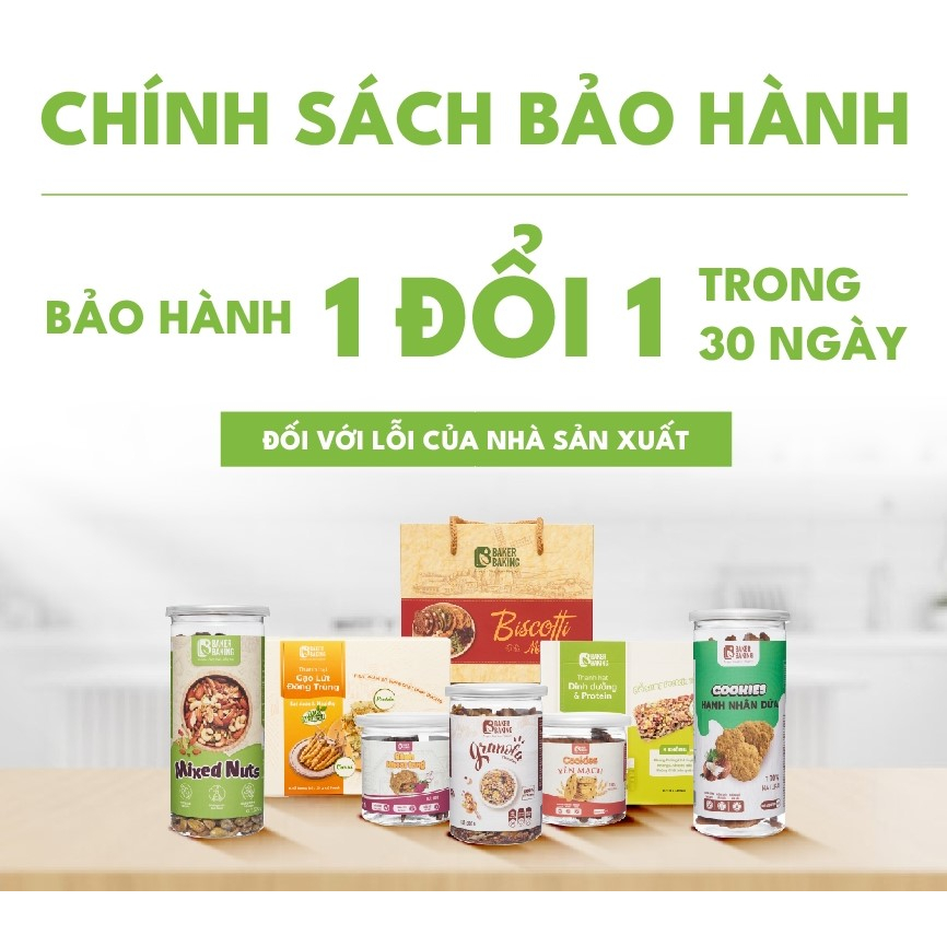 BAKER BAKING CAM KẾT: - Bánh Biscotti của Baker Baking được công ty sản xuất và ra lò mỗi ngày nên các bạn hoàn toàn có thể yên tâm về chất lượng và hạn sử dụng - Cam kết 3 không: Không đường - Không chất béo - Không chất bảo quản - Nguyên liệu nhập khẩu xuất xứ rõ ràng - Hạn sử dụng: 4 Tháng kể từ ngày sản xuất - Ngày sản xuất: In trên bao bì