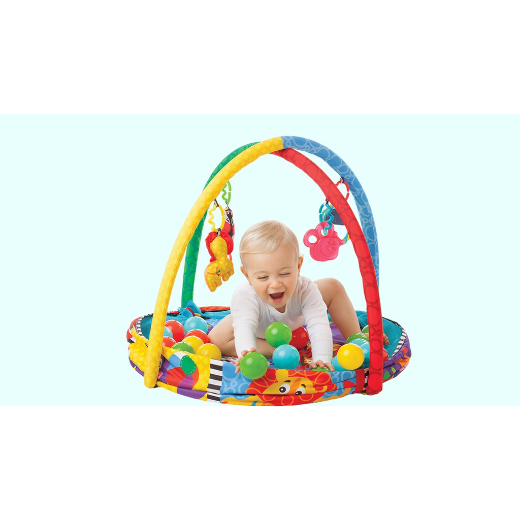 🎪 Bắt đầu cùng chơi nào! Nhà banh có đồ chơi treo nôi đồng hành phát triển cùng bé qua 5 chức năng chơi siêu vui cho bé từ sơ sinh. Có 32 quả bóng sắc màu được cất giữ xung quanh viền tường hoặc để chơi trong lòng thảm. Bốn đồ chơi treo hấp dẫn gồm một đồ gặm nướu có nước có thể được làm mát trong tủ lạnh để làm dịu nướu cho bé, một chiếc gương xinh xắn phản chiếu và hai thú nhồi bông mềm mại.