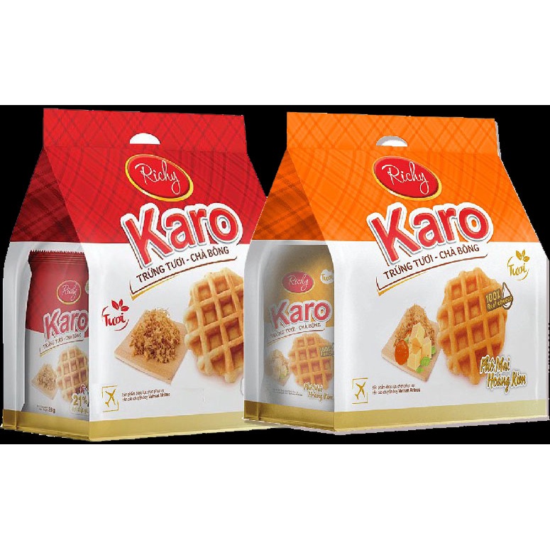 ✳️Bánh trứng chà bông Karo sở hữu vẻ ngoài xốp phồng, mặt bánh có những đường kẻ ngang dọc caro thật ấn tượng và lạ mắt. Màu bánh vàng đậm nhờ có sự kết hợp của ruốc và trứng trông rất hấp dẫn. ✳️ Bánh tươi Karo được làm từ 100% trứng tươi và sợi thịt gà. Với công nghệ tiên phong cho ra đời chiếc bánh đậm đà ✳️Thơm hương trứng, đậm vị chà bông thật hấp dẫn. Bánh mềm xốp, phồng mịn, ruốc đan xen đều khắp bánh. ✳️ Được đóng gói nhỏ gọn trong bao bì, tiện lợi, bánh trứng chà bông Karo phù hợp để mang theo khi đi xa, du lịch, đi chơi, dã ngoại ✴️ Thông tin sản phẩm: ✳️ Hương vị: trứng tươi – chà bông ✳️ Khối lượng tinh: 26g/bánh ✳️ Thành phần: Trứng gà tươi (22,3%), chà bông gà (9,4%) (thịt gà tươi 21%, nước mắm, muối, nước tương), Bột mỳ, đường tinh luyện, dầu thực vật, mạch nha ✳️Xuất xứ: Việt Nam ✳️ Sử dụng: Bóc bánh, ăn liền, tránh để lâu ngoài không khí, sẽ làm ảnh hưởng tới chất lượng của bánh. ✴️ Hướng dẫn bảo quản: – Bảo quản nơi khô ráo, thoáng mát, tránh ánh nắng mặt trời. – Ngày sản xuất/ Hạn sử dụng: In trên bao bì sản phẩm 45 ngày kể từ ngày sản xuất – Bánh tươi Karo hiện đang được sản xuất và phân phối bởi Richy.