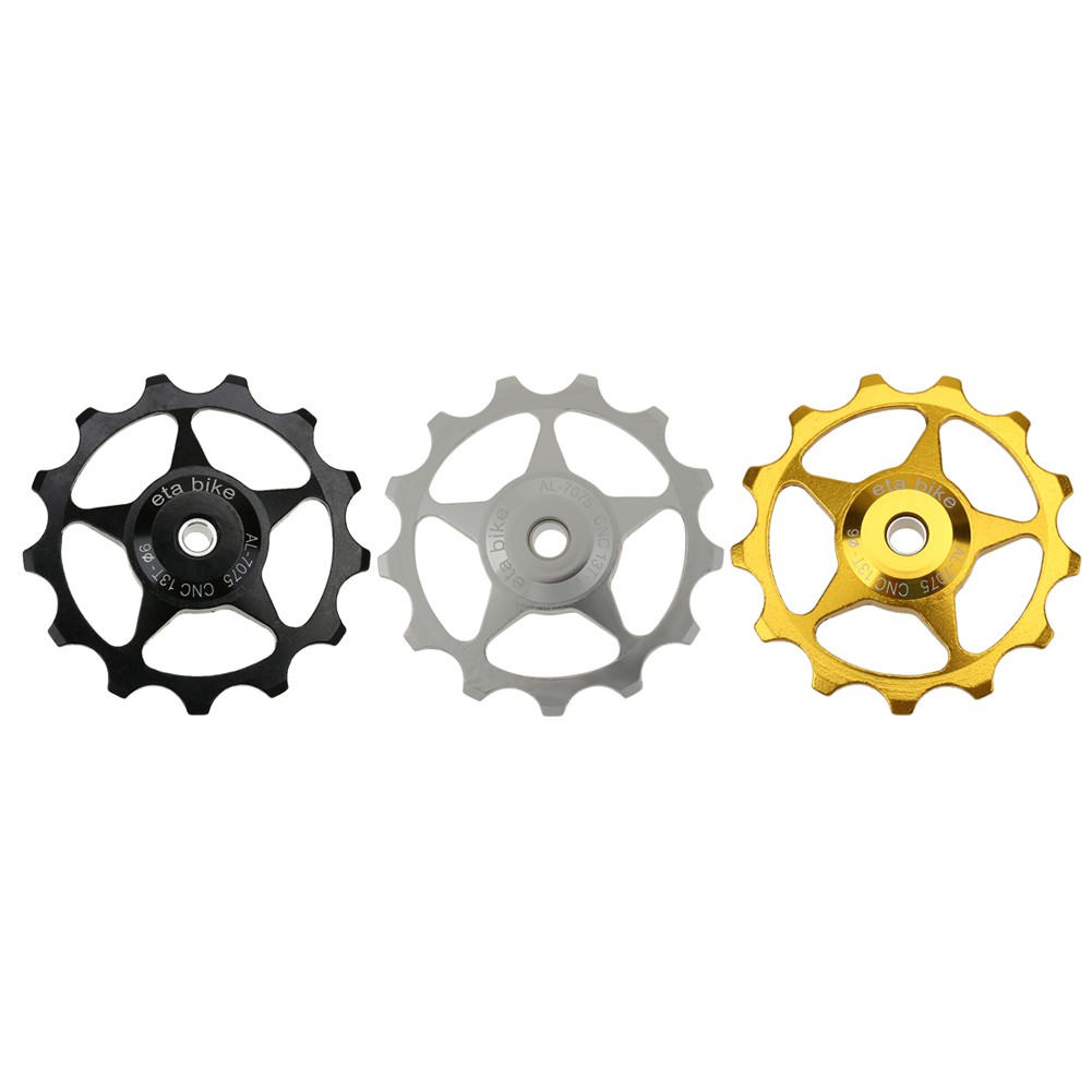 Features: 13 teeth bicycle rear derailleur accessary. Made of CNC aluminum alloy, lightweight and durable. A necessary accessary for your bicycle. Gear: 13T Bearings: Upgraded RS bearing. Colour: Bla, Gold, Silver Weight : 13g Material: Aluminum Alloy