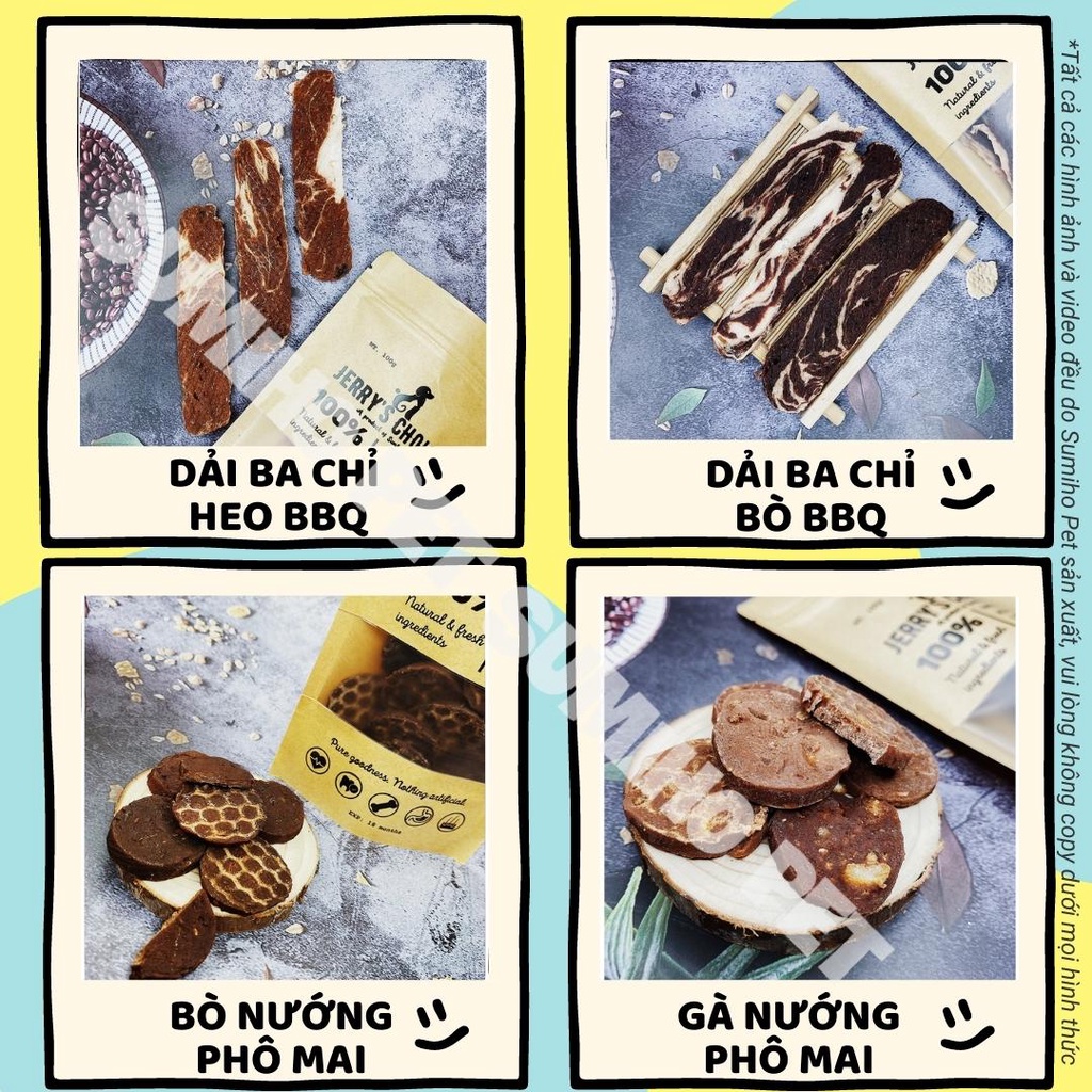 Bánh thưởng cho chó Jerry's Choices với hơn 10 món ăn ngon bổ dưỡng để các bé tha hồ lựa chọn. Sumiho luôn đặt sực khỏe của các bé lên hàng đầu, do đó từ khâu lựa chọn nguyên liệu cho đến quy trình sản xuất và đóng gói luôn phải đạt được tiêu chuẩn tốt nhất Tất cả các món ăn được làm theo đúng khẩu vị đặc trưng của các bé