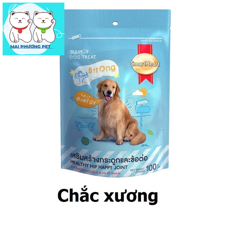 Bánh thưởng cho chó Smartheart 100gr (3 loại) Sạch răng- chắc xương-dưỡng lông Bánh thưởng cho chó Smartheart KL: 100gr 3 loại - Sạch răng - chắc xương - dưỡng lông Ưu điểm của bánh thưởng SmartHeart Với công thức bổ sung sodium, bánh thưởng SmartHeart giúp ngăn hình thành vi khuẩn trong miệng chó, hỗ trợ giảm các vấn đề răng miệng như viêm nướu, đau miệng, sâu răng và hơi thở có mùi. Sản phẩm có cung cấp dưỡng chất và các hợp chất cần thiết để chó của bạn nạp đầy năng lượng sau khi hoạt động ngoài trời hoặc làm bữa ăn phụ trong khi đợi tới giờ ăn chính. Bánh thưởng SmartHeart hỗ trợ hạn chế mảng bám trên răng, ngăn sự hình thành vi khuẩn răng miệng của chó, đồng thời sản phẩm còn hỗ trợ duy trì sự linh hoạt của khớp. Bên cạnh đó, sản phẩm còn hỗ trợ chăm sóc da lông, giúp da và lông của chó đen bóng, mềm mại, hỗ trợ giảm rụng lông và viêm da. Bánh thưởng Smart Heart là dạng snack thưởng vừa là đồ ăn vặt thơm ngon vừa là phần thưởng thú vị mà bạn có thể tặng cho chó của mình. Bánh Thưởng SmartHeart Chăm Sóc Răng Miệng Cho Chó