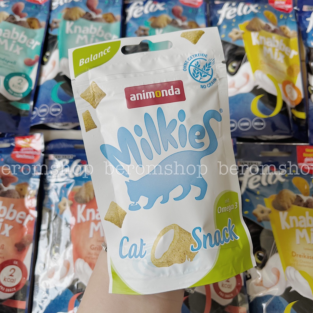 Bánh thưởng cho mèo Animonda nhân sữa có 4 vị: - Milkies Fresh - Chăm sóc răng miệng: - Milkies Harmony - Anti-Hairball tiêu búi lông - Milkies Wellness tăng cường sức khỏe - Milkies Balance cân bằng