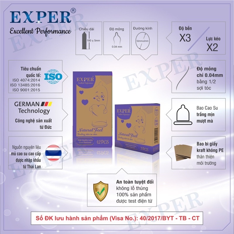 Bao cao su EXPER Natural Feel loại bcs siêu mỏng 003 trơn cổ thắt kéo dài hộp 3 cái. - Bao cao su trơn, siêu mỏng mượt mà (độ mỏng 0.03 = ½ cọng tóc), đảm bảo giúp bạn có những cảm giác chân thật nhất. - Bao cao su với nguồn gốc latex/ mủ cao su cao cấp được nhập khẩu từ Thái Lan. - Bao cao su trắng mịn, mượt mà với nhiều dầu bơi trơn cao cấp. - Bao cao su có hương thơm tự nhiên thơm dịu tạo những cảm giác ngọt ngào.. - Bao cao su EXPER Natural Feel siêu mỏng 003 đạt những tiêu chuẩn chất lượng cao. Sản phẩm bao cao su Exper đã được cấp giấy lưu hành đúng theo quy định của Bộ y tế.
