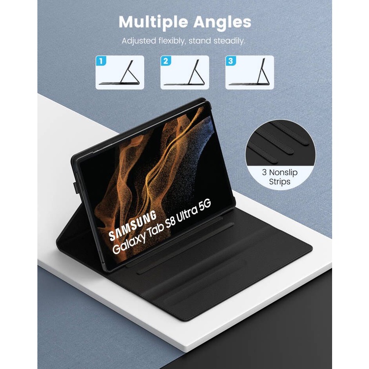 【Tương Thích】: Được thiết kế cho Samsung Galaxy Tab S8 Ultra 14,6 "2022 (SM-X900 / SM-X906 / SM-X906B / SM-X906U / SM-X906N), chỉ. Đường cắt chính xác cho phép bạn dễ dàng truy cập vào tất cả các nút và cổng. 【Giá Đỡ bút tích hợp】: Thuận tiện cho bạn sử dụng S-Pen mọi lúc và mọi nơi, đồng thời bảo vệ điện thoại của bạn không bị thiếu và rơi. 【Đóng Cửa chắc chắn】: Dải từ tính mạnh trên nắp có thể giữ cho vỏ được đóng chắc chắn và đặt máy tính bảng vào chế độ ngủ, giúp bảo vệ máy tính bảng khỏi bị hư hại có thể xảy ra và kéo dài tuổi thọ của pin. 【Nhiều Góc nhìn】: 3 Góc ngang cho phép bạn tạo các góc khác nhau để xem hoặc đánh máy tốt hơn, sẽ giúp bạn rảnh tay. 【Bảo Hiểm đầy đủ】: Da PU cao cấp, vỏ sau sợi nhỏ và vỏ cứng, mang lại khả năng bảo vệ toàn diện chống nước tràn, bụi, va đập, va đập, trầy xước hoặc bất kỳ hao mòn hàng ngày nào khác.