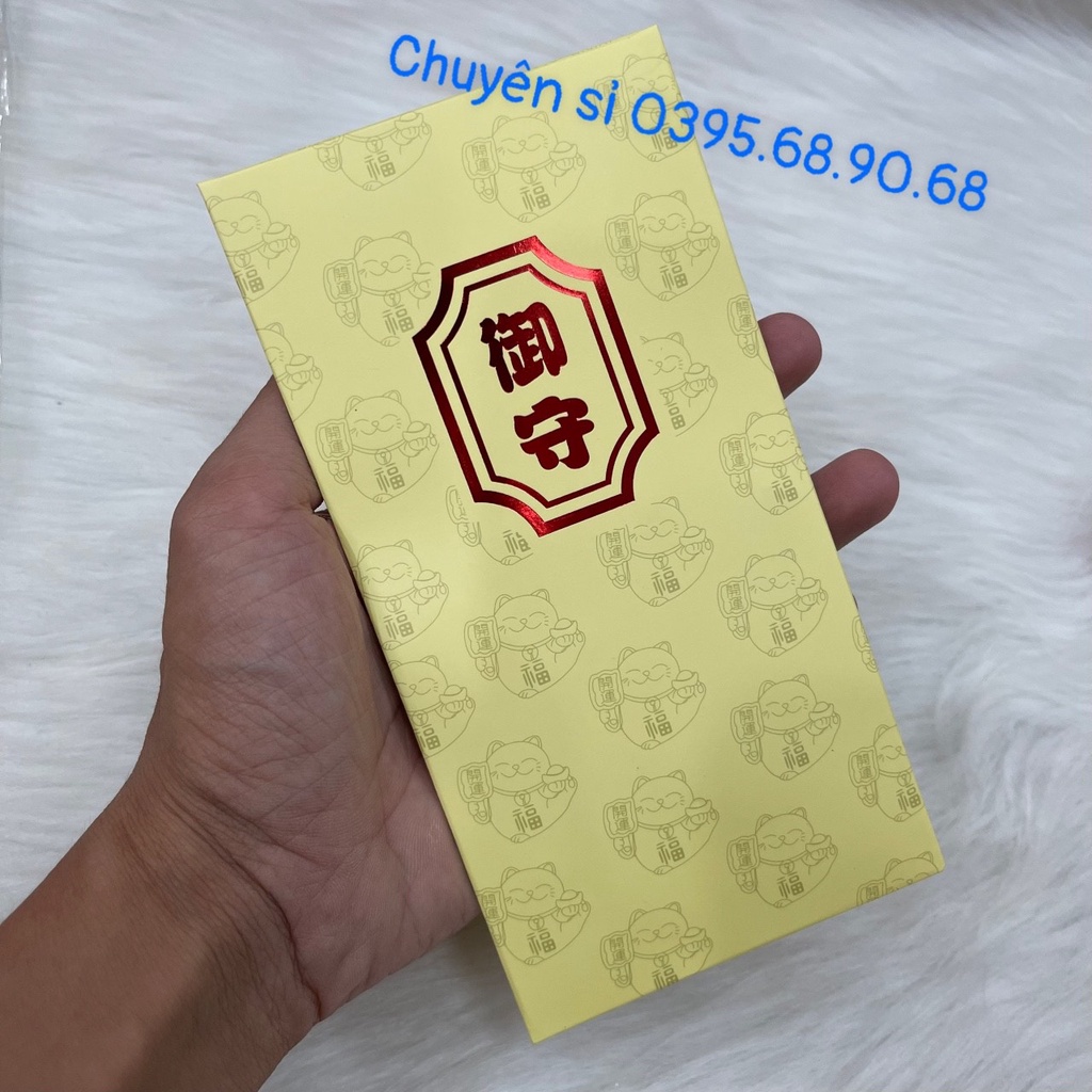Bao lì xì mèo thần tài may mắn có kích thước 7x17cm cùng những hoa văn nổi bật trên bao. Bên trong bao lì xì mèo thần tài là hình ảnh chú mèo Maneki Neko màu vàng và được bảo vệ bằng lốp nhựa Arctic tránh trầy xước.