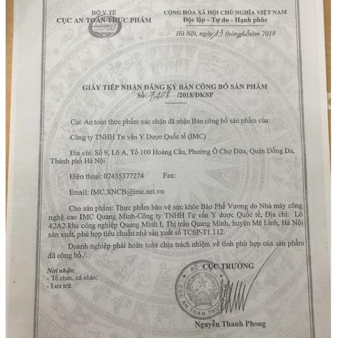 Chịu trách nhiệm về sản phẩm: CÔNG TY TNHH TƯ VẤN Y DƯỢC QUỐC TẾ Sản xuất tại: Nhà máy công nghệ cao IMC Quang Minh. Thương nhân chịu trách nhiệm chất lượng và phân phối: Công ty TNHH Dược Phẩm Á Âu. Xác nhận công bố: Số: 7408/2018/ĐKSP Xác nhận quảng cáo: Số: 00268/2019/ATTP-XNQC Xuất xứ: VIET NAM.