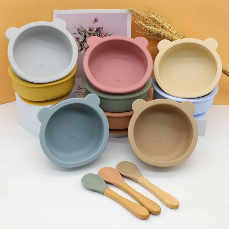 Mẹ Lạc có: Bát ăn dặm silicone hình gấu và sư tử đáng yêu, hít dính chống lật tặng kèm thìa cùng màu