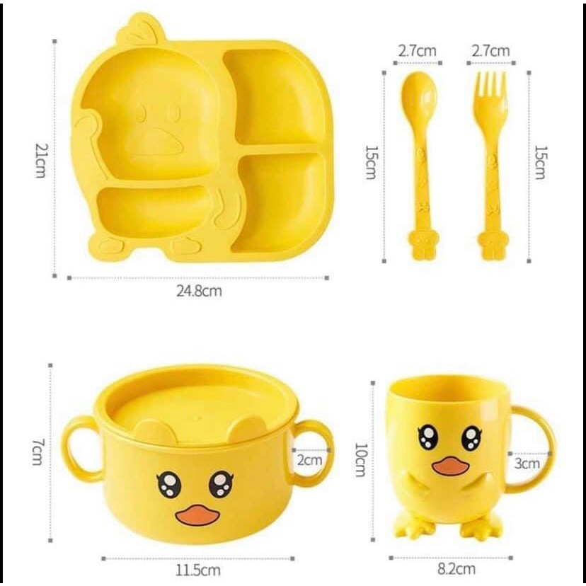 ✴️Bộ ăn dặm vịt vàng ☑️ Gồm 5 món: Khay, bát, cốc, thìa, nĩa. ☑️ Màu sắc: màu vàng tươi. ☑️ Hình ảnh trên sản phẩm được in sắc nét và dễ thương. ✴️ Thông số sản phẩm ☑️ Chất liệu: Nhựa PP cao cấp ☑️ Kích thước : 11.5cm x 8.5cm x 15.8 cm ✴️ Công dụng ☑️ Bộ sản phẩm với hình thù chú vịt vàng dễ thương, ngộ nghĩnh giúp bé thích thú khi ăn. ☑️ Cốc và bát có tay cầm, giúp cầm nắm lúc thức ăn còn nóng. ☑️ Bát có nắp đậy: Bảo vệ thức ăn của bé không bị bụi bẩn hay côn trùng rơi vào. Ngoài ra nắp đậy bảo quản và giữ nhiệt thức ăn của bé được lâu hơn. ☑️ Khay có nhiều ngăn: Đựng đa dạng và phù hợp với các món ăn khác nhau. VD: thức ăn dạng sợi, thức ăn củ quả, cháo,...