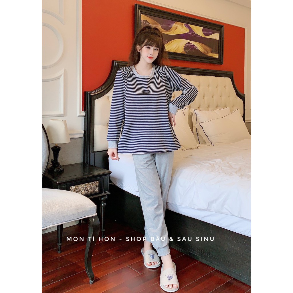 Bộ bầu sau sinh mặc nhà kẻ nhỏ | Có chun rút điều chỉnh bụng & thiết kế vén cho bé tuti Free size 50-65kg Màu: Kẻ xanh đậm, kẻ ghi xám, kẻ xanh nhạt Chất cotton da cá dày dặn mặc thu đông #bomacnhabausausinh #bomacnhabau #bomacnhasausinh #bosausinh