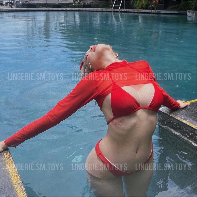 BDY3111151 - Bikini Đỏ Kèm Áo Voan Cổ Lọ Phong Cách - Đồ Bơi Gợi Cảm Phong Cách Âu Mỹ