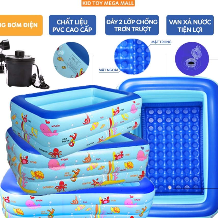 THÔNG SỐ SẢN PHẨM: + Công Dụng: - Làm Bể Bơi - Làm Bể chơi các đồ dưới nước: câu cá, thả vịt cao su... - Làm bể chơi: Cát, Đất nặn.. - Làm Nhà bóng/banh cho bé 2. Kích thước: - Chiều dày thành bể: 15cm - Kích thước: (đo thực, tổng) + Loại 1m3: 130x90x50cm (3 tầng) + Loại 1m5: 143x103x50cm (3 tầng) + Loại 1m8: 175x125x50cm (3 tầng) + Loại 2m1: 197x140x50cm (3 tầng)