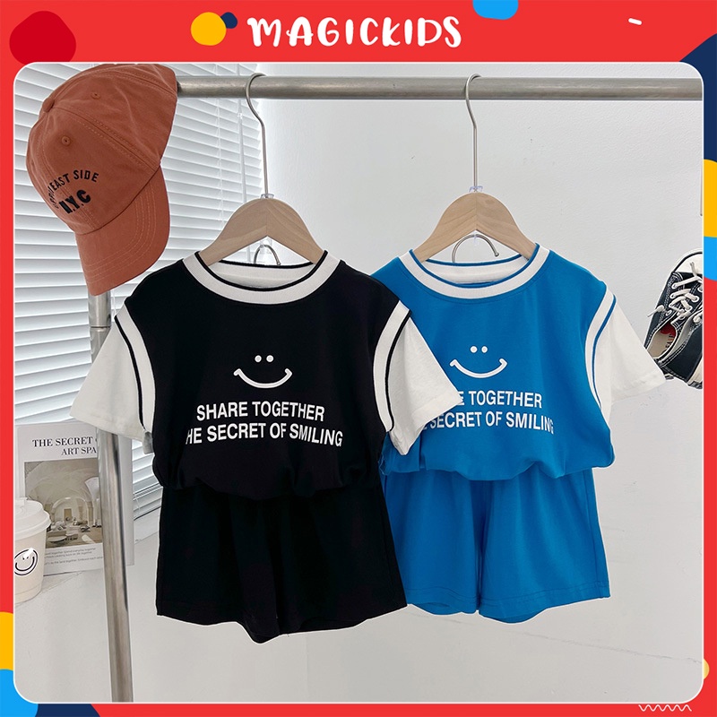 Giới thiệu Đồ bộ bé trai Hàn Quốc cộc tay Magickids áo thun phối tay, quần đùi chất cotton thấm hút mồi hôi Quần áo trẻ em BR22026