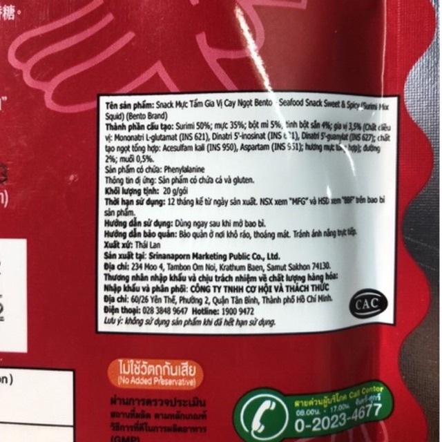 BENTO MỰC TẨM GIA VỊ THÁI LAN MÓN NHẬU CỰC NGON - Thành phần: mực, surimi, bột mì, ớt, đường, muối... - Khối lượng: gói 5g - 20g - Cách dùng: dùng ngay sau khi mở bao bì. - NSX: in trên bao bì - HSD: in trên bao bì - Bảo quản: nơi khô ráo thoáng mát ------------------ Hướng dẫn MUA nhiều mặt hàng /1 đơn hàng của Shop: Bước 1: Chọn từng mặt hàng với số lượng/ màu sắc/ vị -> ấn thêm vào giỏ hàng. Bước 2: Vào giỏ hàng của bạn (ở phía góc trên cùng bên phải) chọn bằng cách tích những sản phẩm bạn muốn mua rồi ấn mua hàng. Tip: Bạn đừng quên sử dụng mã FREESHIP để được hỗ trợ tiền ship nha. ***** BUN_SHOP1205 CAM KẾT: 1: Sản phẩm đúng nguồn gốc, xuất xứ. 2: Sản phẩm đúng chất lượng, an toàn cho sức khỏe người tiêu dung 3: Shop không bán hàng cận date hoặc hết date 4: Cam kết hoàn tiền 100% nếu xảy ra lỗi của Shop. Cảm ơn quý khách hàng đã luôn tin yêu và ủng hộ shop. Rất mong được phục vụ các bạn. Mọi thắc mắc về sản phẩm cũng như đơn hàng xin quý khách IBOX ngay cho Shop để được hỗ trợ nhanh nhất.