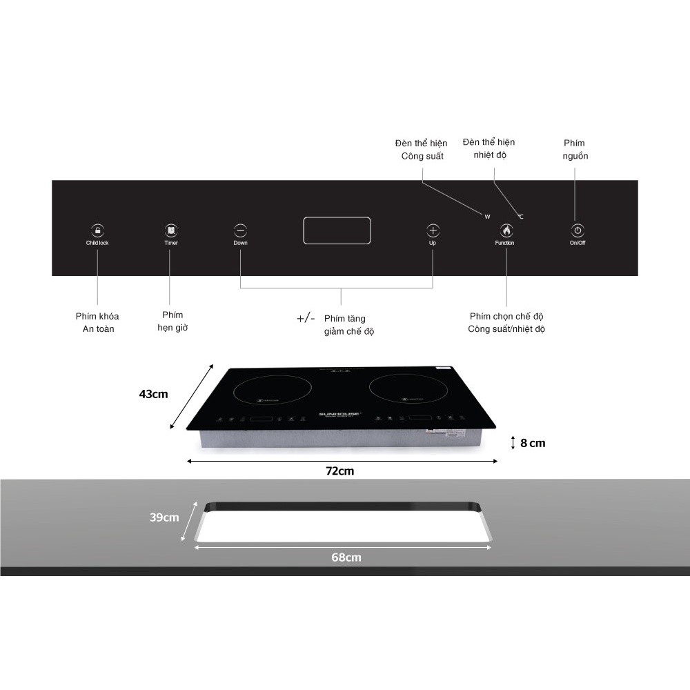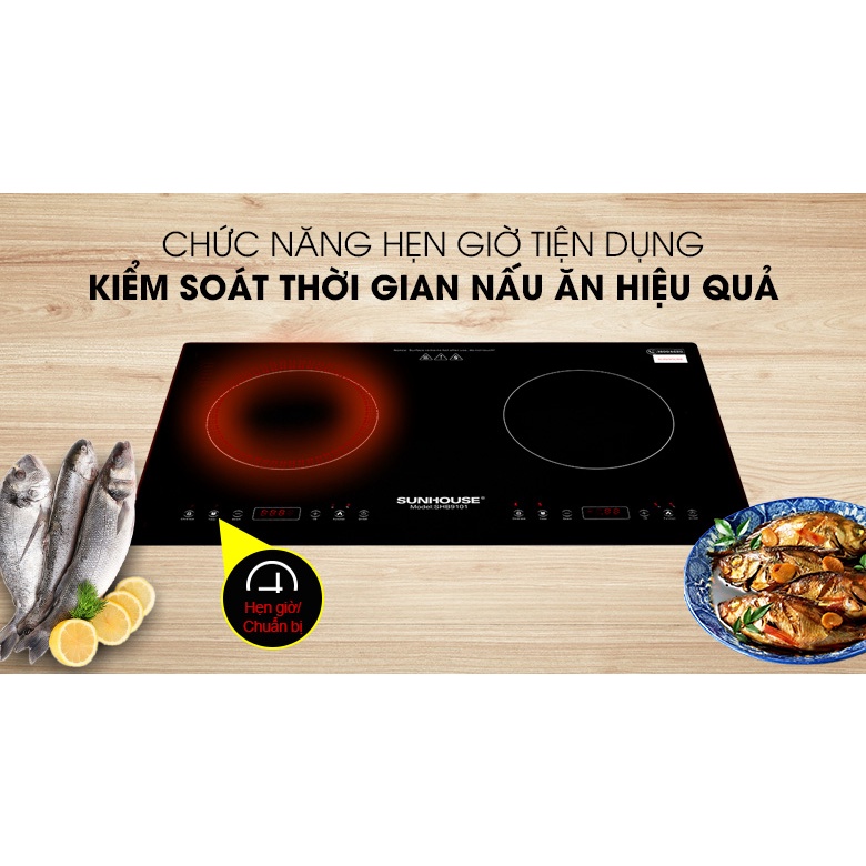 - Bếp đôi điện từ SUNHOUSE SHB9101 có kiểu dáng sang trọng với mặt kính đen toàn phần, các chi tiết trên bề mặt bếp được tối giản, tinh tế. Đặc biệt, thiết kế lắp âm càng tạo nên sự hiện đại cho căn bếp của bạn. - Mặt bếp làm bằng kính cao cấp, dày 4mm, chịu lực, chịu nhiệt tốt và có độ bền vượt trội. Đặc biệt, bề mặt bếp sáng bóng, nhẵn mịn nên rất sang trọng và dễ dàng vệ sinh sau khi sử dụng. - Sản phẩm có bảng điều khiển cảm ứng hiện đại kèm màn hình hiển thị đa thông tin, hoạt động độc lập cho từng vùng bếp nên rất dễ sử dụng. Chỉ vài thao tác chạm nhẹ tay trên sản phẩm, bạn đã lựa chọn được chế độ hoạt động mong muốn. - Bếp đôi điện từ SUNHOUSE SHB9101 có 2 vùng nấu rộng rãi giúp bạn chế biến được nhiều món ăn cùng lúc. Bạn có thể vừa nấu canh, vừa chiên xào thực phẩm một cách thật thoải mái. - Với công suất lớn và khả năng làm nóng nhanh gấp 2 lần bếp thường, SHB9101 nhanh chóng làm nóng nồi chảo để làm chín thực phẩm, giúp bạn tiết kiệm thời gian nấu nướng và tiết kiệm điện năng cho gia đình. - Bếp đôi điện từ SUNHOUSE SHB9101 với mâm từ được làm bằng 100% dây đồng siêu bền, giúp truyền nhiệt tốt và tăng tuổi thọ của bếp. - Bếp đôi điện từ SUNHOUSE SHB9101 được trang bị nhiều tính năng hiện đại như hẹn giờ, khóa trẻ em và cảm ứng nhiệt, tự động ngắt khi quá tải giúp đảm bảo an toàn cho người sử dụng và nâng cao độ bền cho bếp. - Bếp đôi điện từ SUNHOUSE SHB9101 không sử dụng phích cắm trực tiếp vào nguồn điện chung trong gia đình mà kết nối thông qua 1 aptomat riêng biệt. Bởi bếp hoạt động với công suất cao, lên tới 3600W, nếu sử dụng phích cắm thông thường sẽ rất dễ gây chập, cháy nổ,... mất an toàn. Vì vậy, thiết kế đặc biệt của SUNHOUSE giúp mang lại khả năng vận hành ổn định cho bếp và sự an toàn tuyệt đối cho người sử dụng.