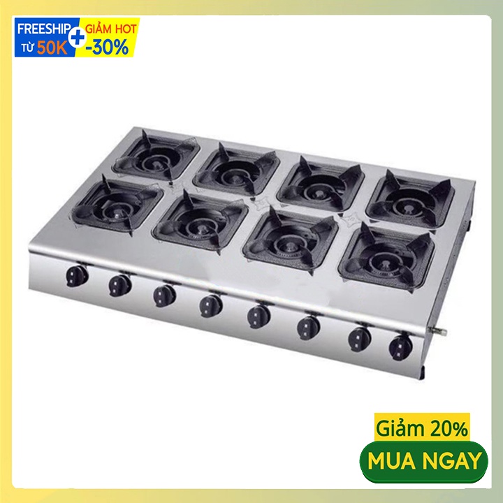 ⛵ THÔNG SỐ KỸ THUẬT: + Tên sản phẩm: Bếp Ga 8 Họng + Chức năng: Dùng nấu mì cay,cơm niêu,tráng bánh xèo,nấu bánh canh,nấu cháo ếch,… Thích hợp dùng cho nhà hàng,quán ăn + Kích thước: 90x56x12cm + Chất liệu: Inox 304 Không gỉ + Trọng lượng: 13 Kg Bếp Gas 8 Họng là bếp nấu sử dụng bằng gas có 8 lò đốt hay còn gọi là có 8 bếp nằm liền kề nhau thì được gọi là bếp ga 8 họng. Bếp Gas 8 Họng thường được dùng nhiều trong các quán mì cay,quán cơm niêu hay những quán bán bánh xèo. Sự kết hợp những chiếc bếp gas công nghiệp với những chiếc bàn inox làm thành những chiếc bàn bếp gas công nghiệp khiến cho gian bếp của bạn trở nên hiện đại, sạch đẹp và chuyên nghiệp hơn. Bàn bếp gas công nghiệp có thêm vòi rửa hoặc thêm bầu nước (tùy yêu cầu của khách hàng) và ghi thoát nước khiến cho việc nấu nướng của đầu bếp trở nên tiện lợi và dễ dàng vệ sinh hơn. Đây cũng là yếu tố giúp cho việc nấu nướng sạch sẽ và hợp vệ sinh. Bếp sử dụng chất liệu inox chống hoen rỉ, không bị ăn mòn bởi các thành phần có trong thức ăn. Khả năng chống bám dính cực tốt giúp bạn vệ sinh dễ dàng hơn Kiềng bằng sắt sơn tĩnh điện rất dày, chịu được trọng lượng lớn nên bạn không cần lo bị gãy vỡ khi nấu thức ăn với số lượng nhiều Bếp sử dụng hệ thống đánh lửa cơ đốt cháy ga ở lần bật đầu tiên, không lo ẩm ướt ⛵