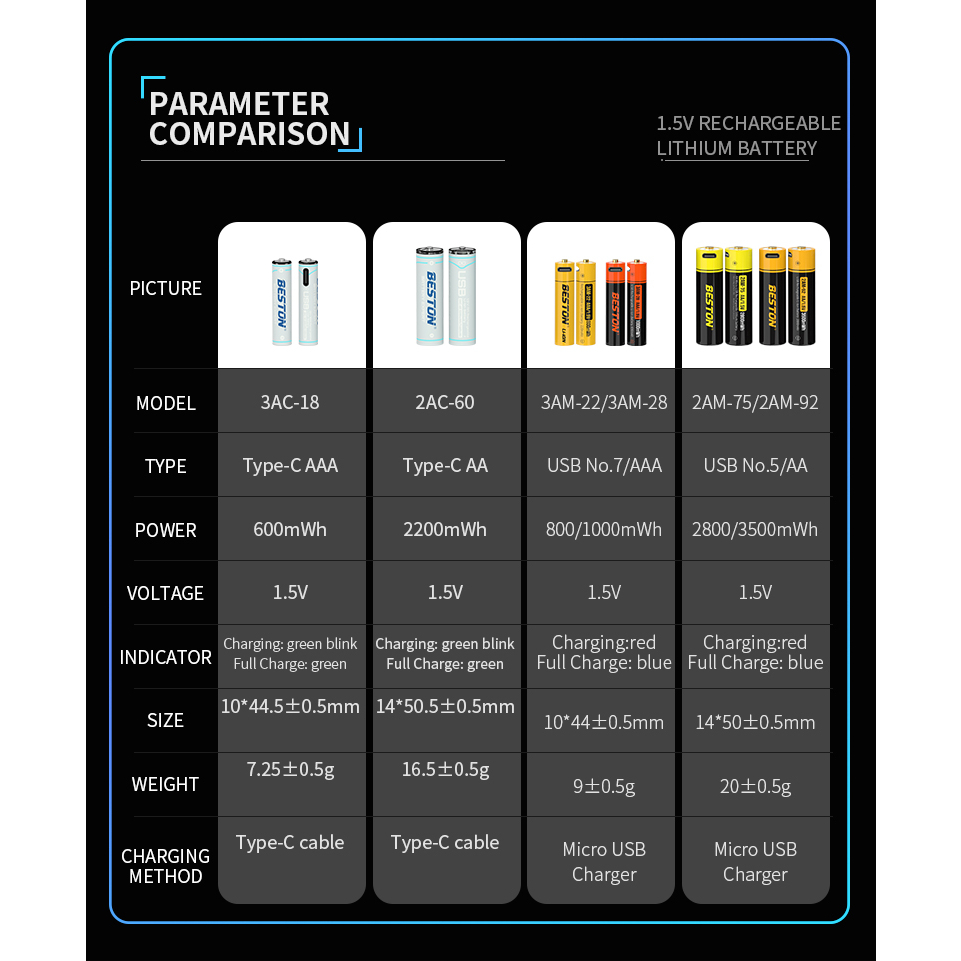 Giới thiệu BESTON Vỉ 4 pin sạc USB 1.5V 2AC-60 Type C Lithium AA 2200mWh/1460mAh chất lượng cao