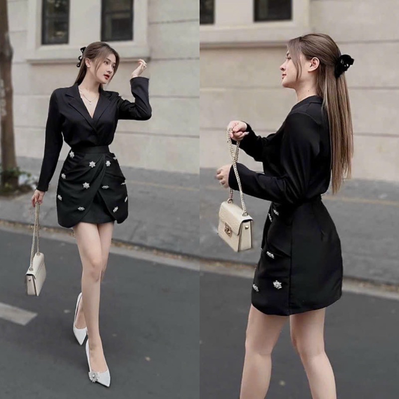 Giới thiệu BIGSIZETIX Set 2 món : áo sơ mi cổ vest tay dài + chân váy đính đá 50-90kg