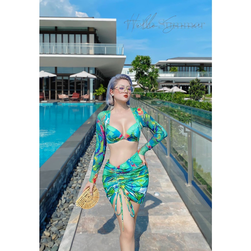 Bikini Nữ Hai Mảnh ComBo 3 Món, Đồ Bơi Đi Biển Hai Mảnh Aó Dài Tay Kèm Chân Váy Rút Họa Tiết Sang Đẹp Binsports BHV183