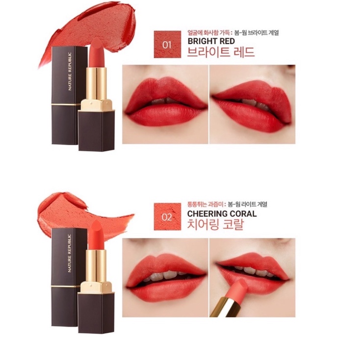 💕 Đây là dòng son mới của hãng Nature Republlic đó các nàng, nhìn màu swatch mê ly luôn á. Chất son em này cực kì mịn luôn ạ, bạn nào mà xài e này thì bảo đảm nghiện luôn nha. 💕 Son đẹp từ lớp vỏ sang chảnh cho đến chất son cực xịn luôn á. Lúc xem các bạn beauty Hàn review mà thích lắm, chất cực kỳ cực kỳ mịn luôn đó, hoàn toàn thích hợp cho các cô nàng môi khô. 💕 Công dụng sản phẩm: -Giúp dưỡng ẩm nhẹ và làm dịu đôi môi nhưng vẫn giữ màu bền lâu suốt cả ngày. ngày.