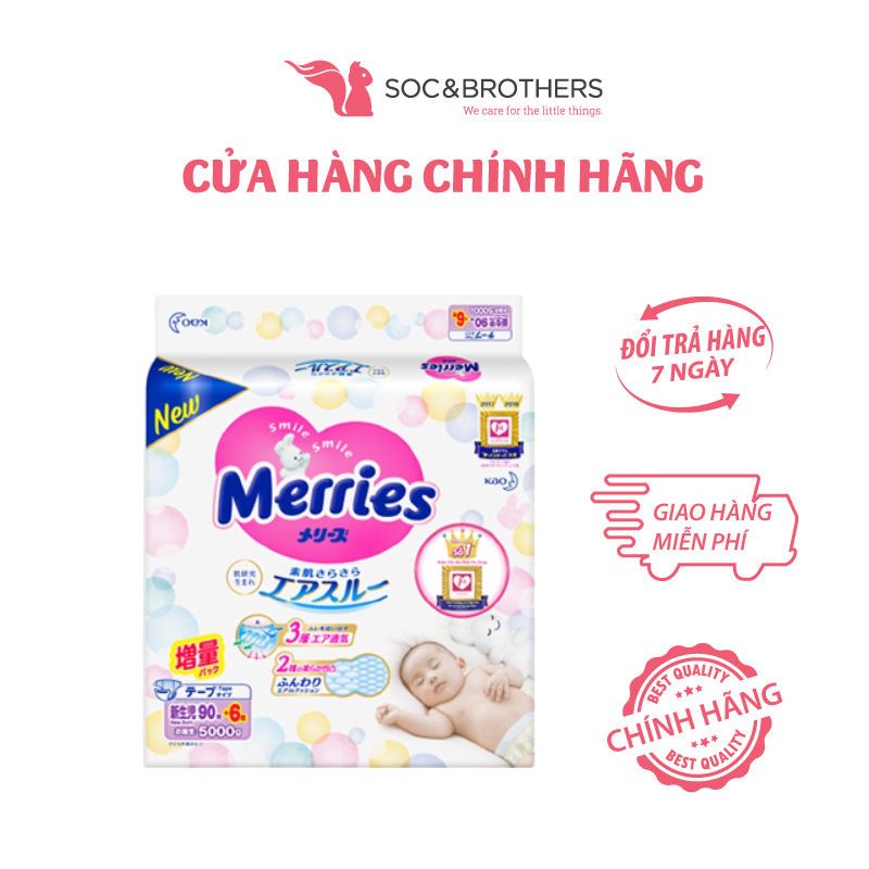 Bỉm Merries Newborn 90 Tã dán Merries Newborn NB 90 là sản phẩm tã dán đặc biệt dành riêng cho bé sơ sinh. Với chất liệu siêu mềm mại, an toàn với làn da vô cùng nhạy cảm của bé cùng với bề mặt tiếp xúc hàng ngàn điểm xốp mịn, giúp bé luôn khô ráo và thoải mái, bỉm Merries Newborn chắc chắn là người bạn đồng hành tuyệt vời cùng bé giai đoạn đầu đời.
