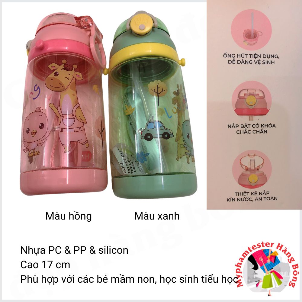 Chất liệu: nhựa PC & PP & silicon Kích thước: fi 7.6 x 17.3 cm Bình có 2 màu: màu xanh lá cây và màu hồng Dung tích: 450ml Thiết kế: Hươu cao cổ và gà con xinh xắn